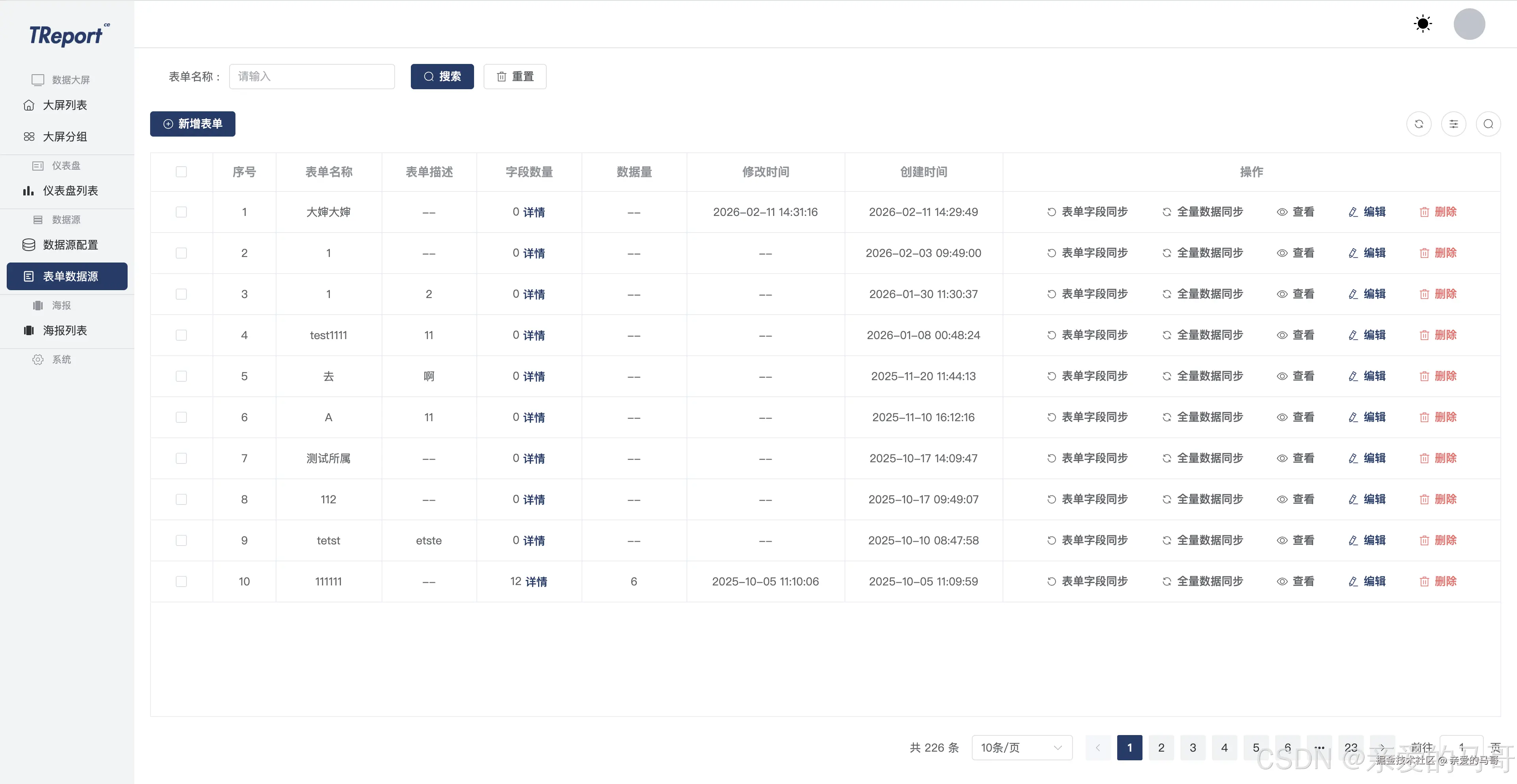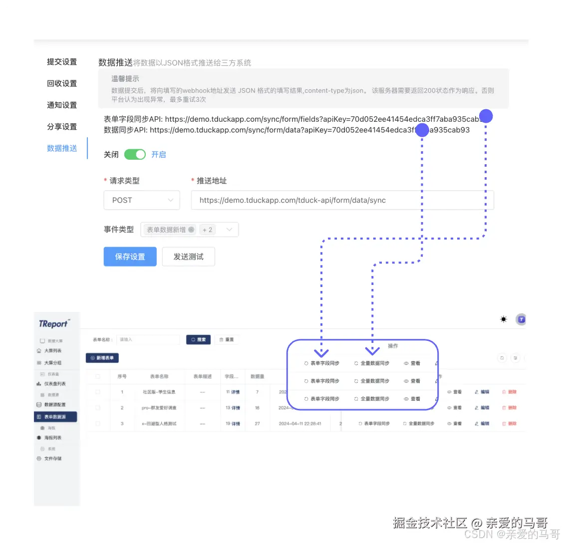 - 进入表单后台,点击数据推送,复制【表单字段同步 API】填入大屏端【表单数据源】中的对应配置入口