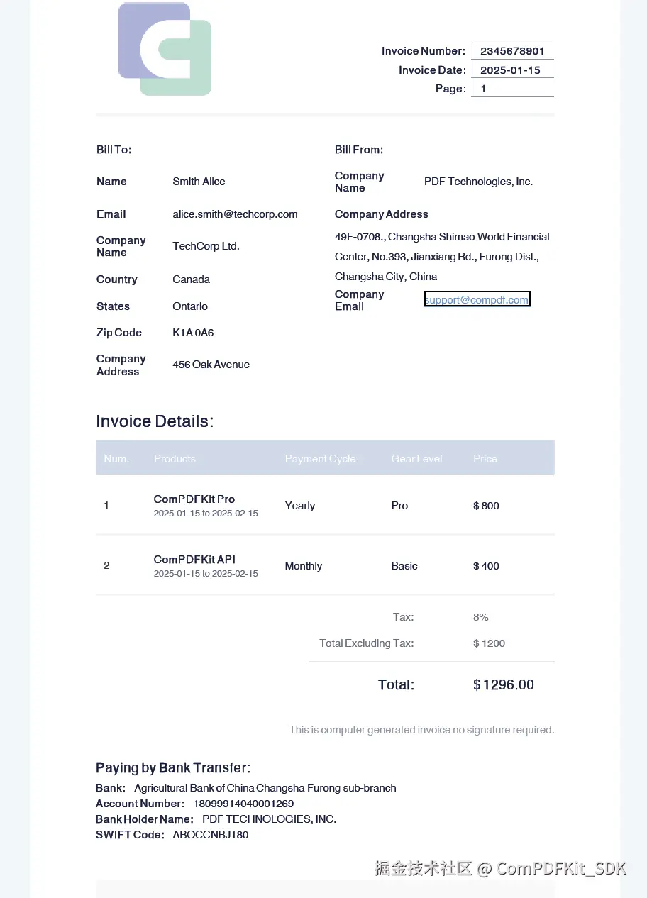 “从 HTML 生成”功能需要一个 HTML 模板和用于填充该模板的结构化数据(JSON 数据),以生成标准的 HTML 代码。然后,通过“从 HTML 生成”功能的相应界面,您可以将该标准 HTML 代码转换为 PDF 文档。下面是使用ComPDF 生成SDK的生成PDF文件的步骤