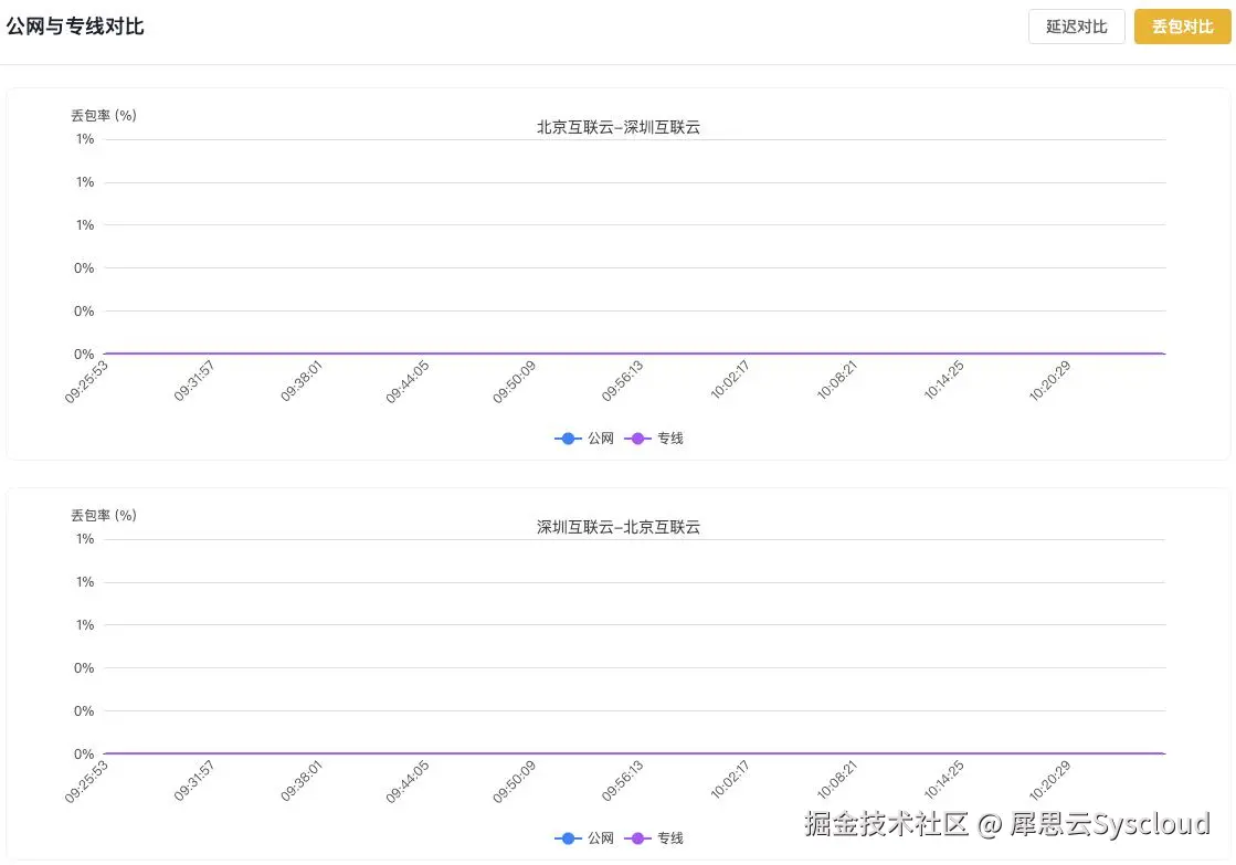 **3、丢包率结果:**北京-深圳的公网与专线(最近一小时)