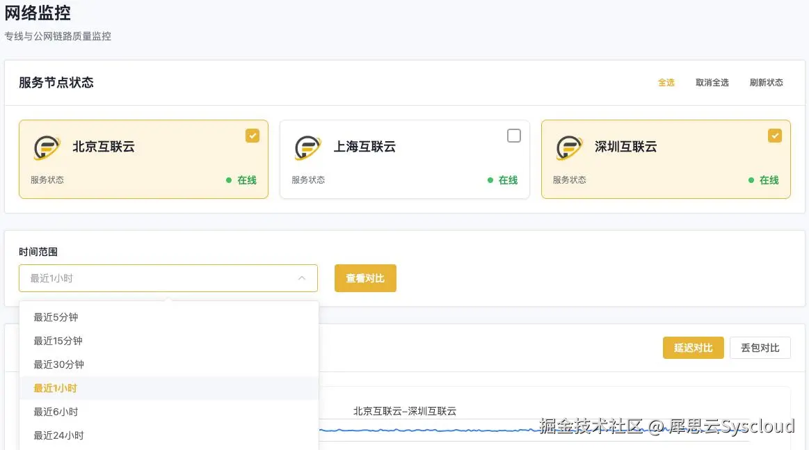 ■ 跨地域公/专网: 实时监测数据,直观对比公网与专线的延迟/丢包,让SLA不再是数字。