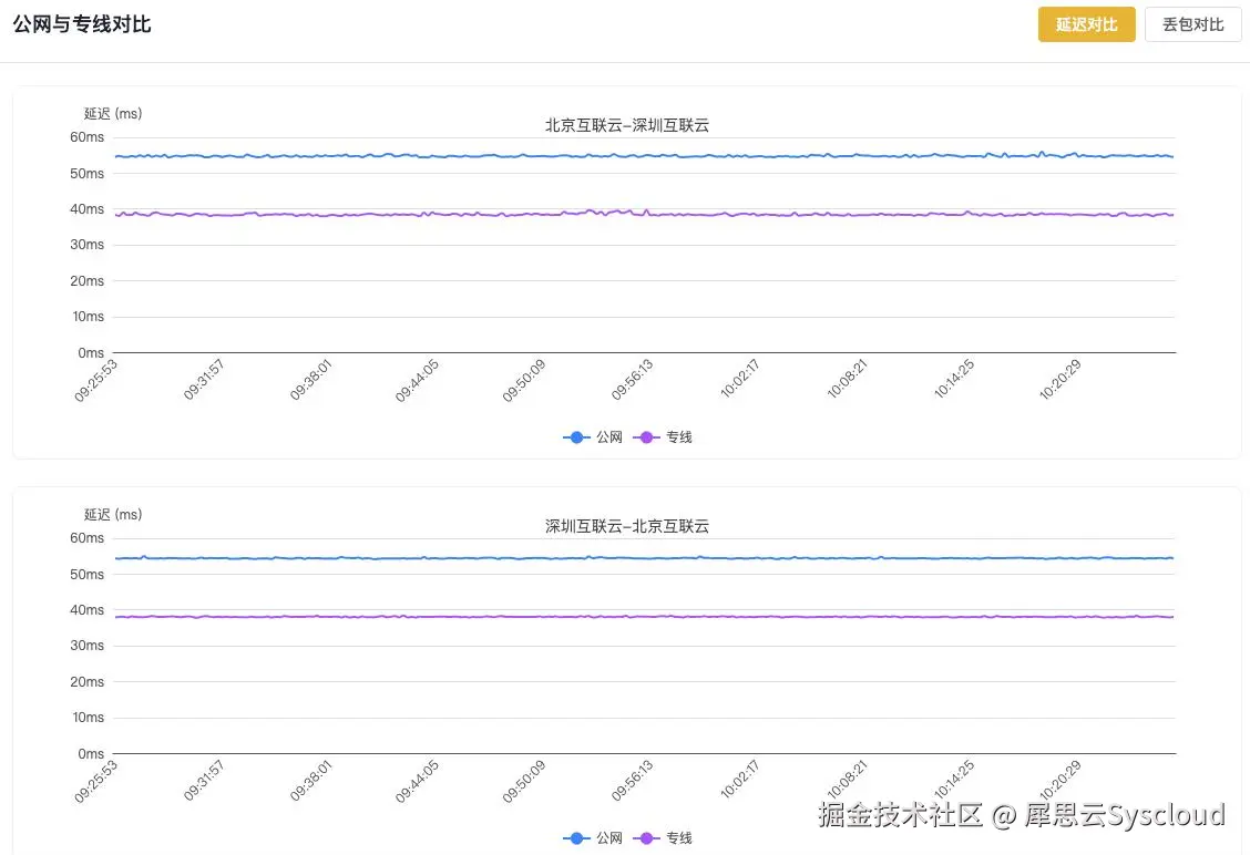 **2、网络延迟结果:**北京-深圳的公网与专线(最近一小时)