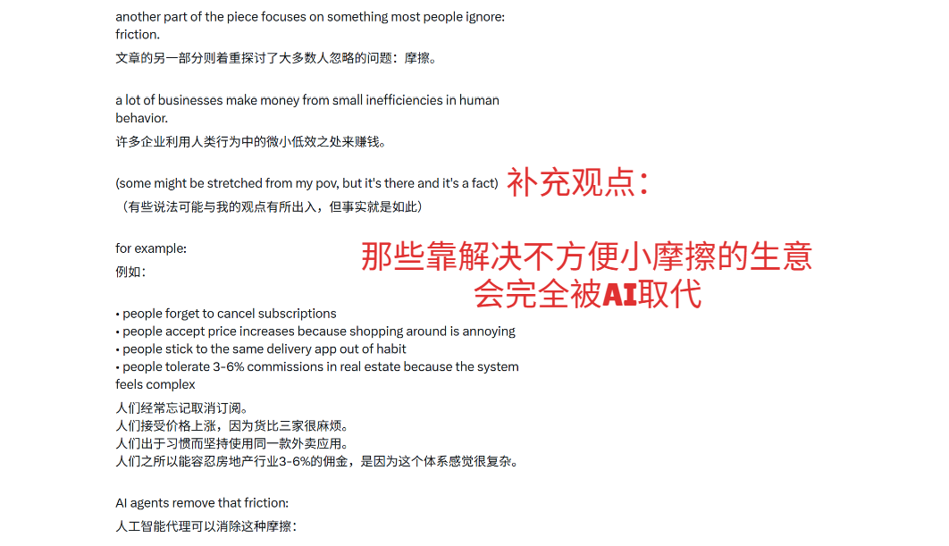 补充观点:那些靠解决不方便小摩擦的生意会完全被AI取代。