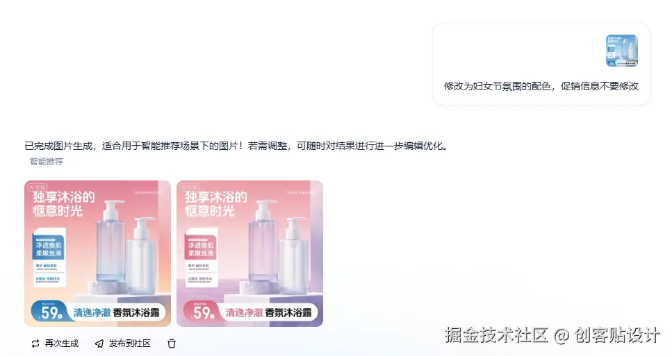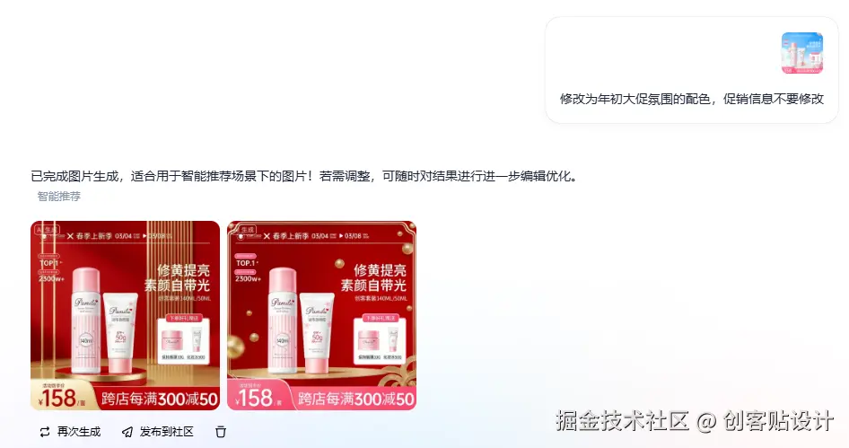 - 如果对生成的设计稿不满意,不用重新输入提示词,点击 【重新生成】 ,AI会生成新的款式;也可以修改提示词 (比如增加“添加小图标”“字体加粗”) ,让生成效果更贴合需求,新手可以多尝试几次调整提示词,找到最优效果!