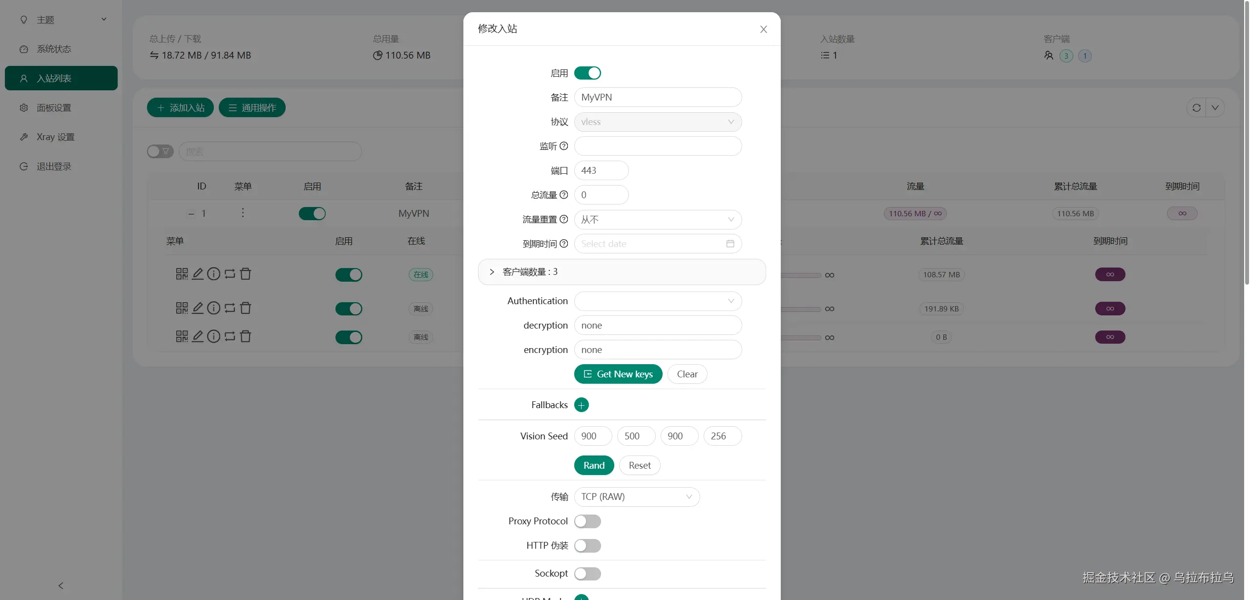 点击Get New Cert以及Get New Seed,生成公钥私钥,这里还会自动生成Short IDs,后续配置yaml会用到