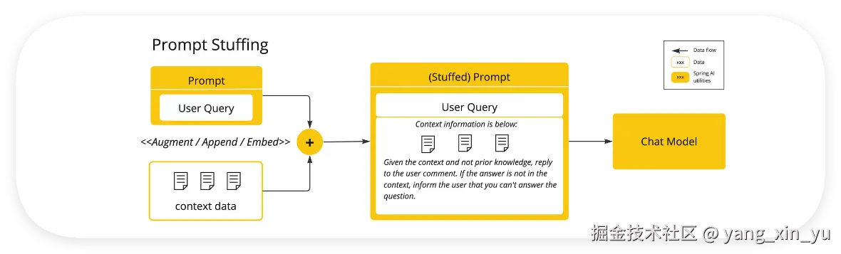 Prompt Stuffing(提示填充):一种更实用的替代方案是将您的数据嵌入提供给模型的提示中。考虑到模型的令牌限制,需要使用技术在模型的上下文窗口中呈现相关数据。这种方法俗称“填充提示”。Spring AI 库可帮助您基于“填充提示”技术(也称为检索增强生成 (RAG))实现解决方案。
