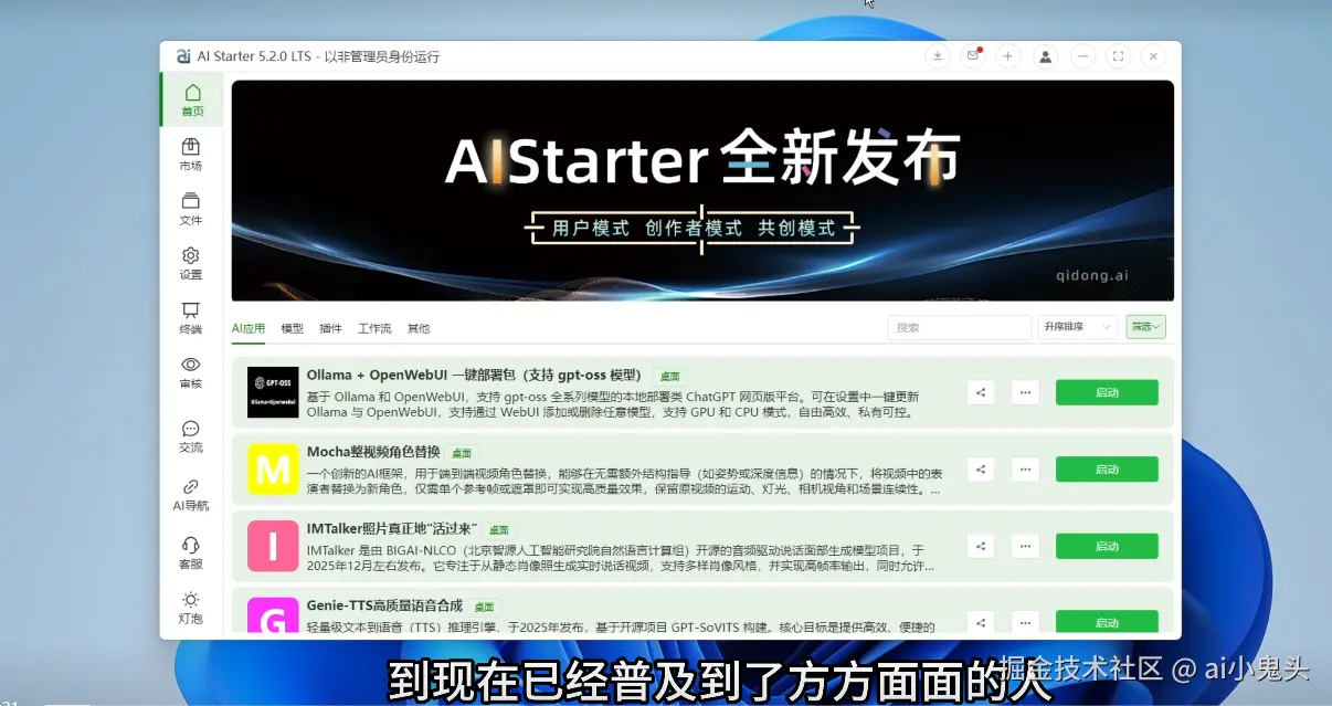 系统装好后,AIStarter 基本 100% 可用,所有项目一键启动丝滑。