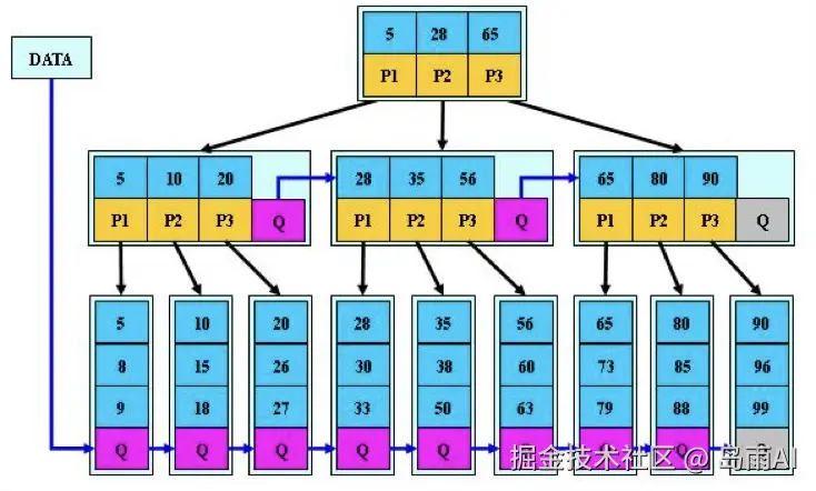 - 所有关键字都出现在叶子结点的链表中(即数据只能在叶子节点【也叫稠密索引】),且链表中的关键字(数据)恰好是有序的
