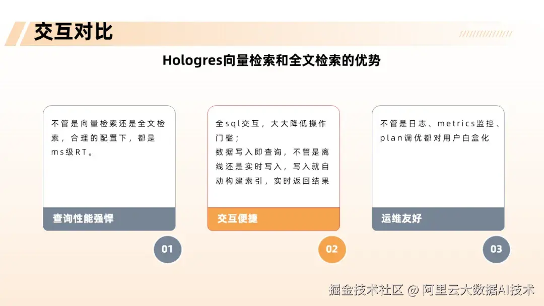 相比 Elasticsearch 等传统全文引擎,Hologres 的配置更为直观,无需理解复杂的 JSON 参数,大幅降低使用门槛。同时,其与 OLAP 能力的原生集成,使得“检索+分析”一体化成为可能。