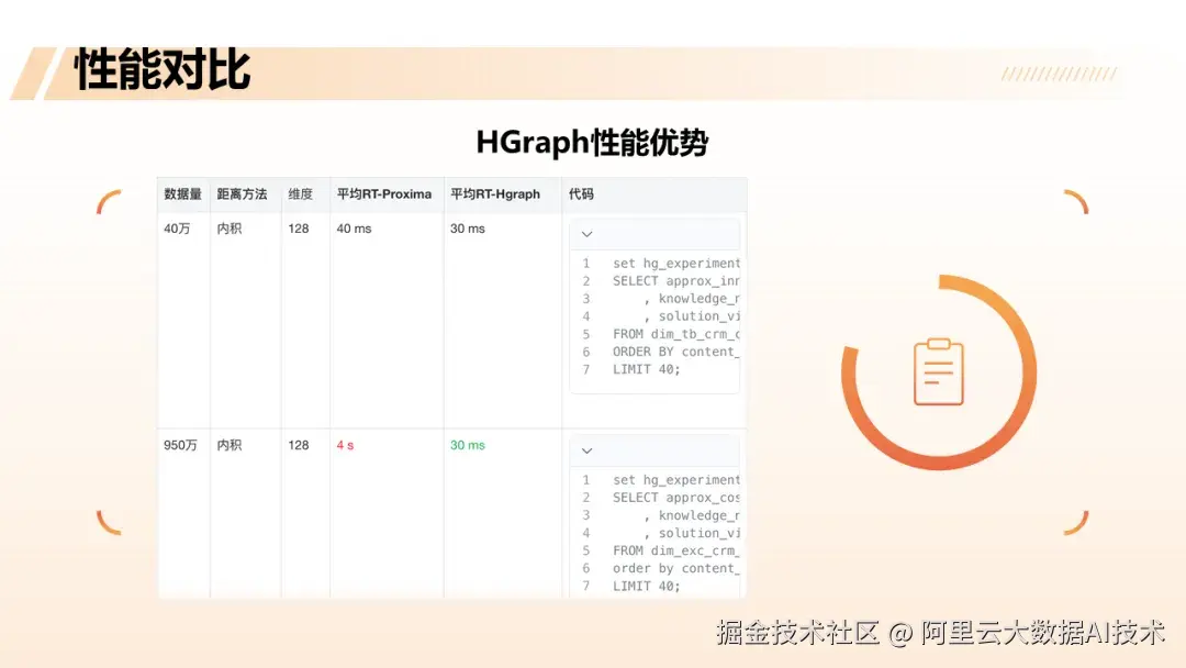 在向量检索引擎选型中,团队对 HGraph 与 Proxima 进行了实测对比。在40万条、128维内积向量的场景下,两者性能差异尚不明显(Proxima 约40ms,HGraph 约30ms)。但在950万条(近千万级)数据下,Proxima 的平均 RT 飙升至4秒,而 HGraph 仍稳定在 30毫秒左右——仅指纯向量召回阶段,若叠加后续 OLAP 操作(如过滤、排序),整体延迟通常控制在数百毫秒内,完全满足业务需求。