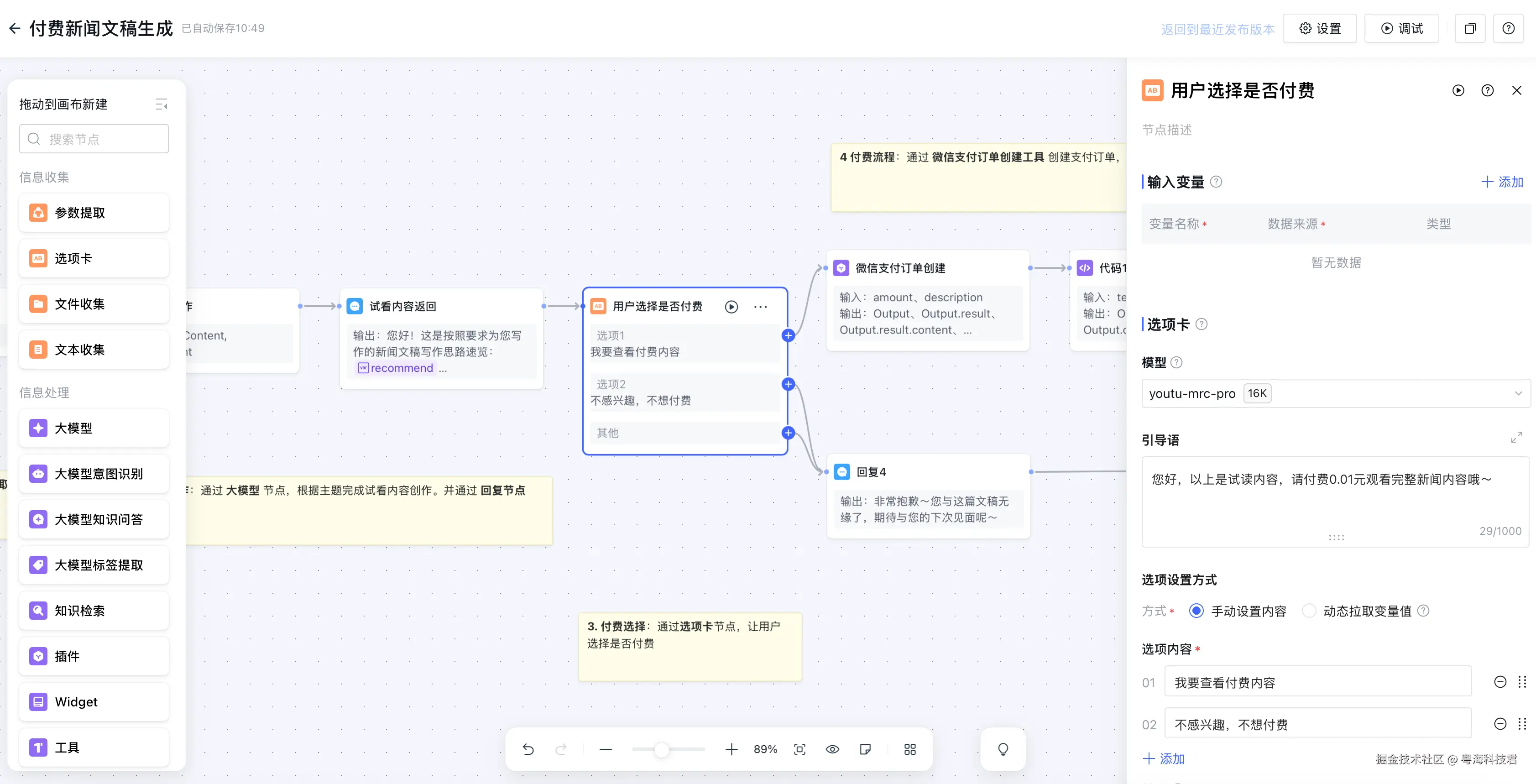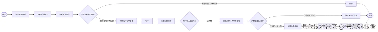 付费新闻文稿生成工作流采用了"试看-付费-解锁"的三段式设计,整个流程包含以下核心环节: