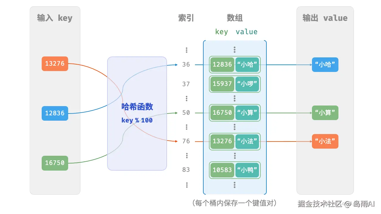 散列表(Hash table,也叫哈希表),是根据关键码值(Key value)而直接进行访问的数据结构。也就是说,它通过把关键码值映射到表中一个位置来访问记录,以加快查找的速度。这个映射函数叫做散列函数,存放记录的数组叫做散列表。示意图如下: