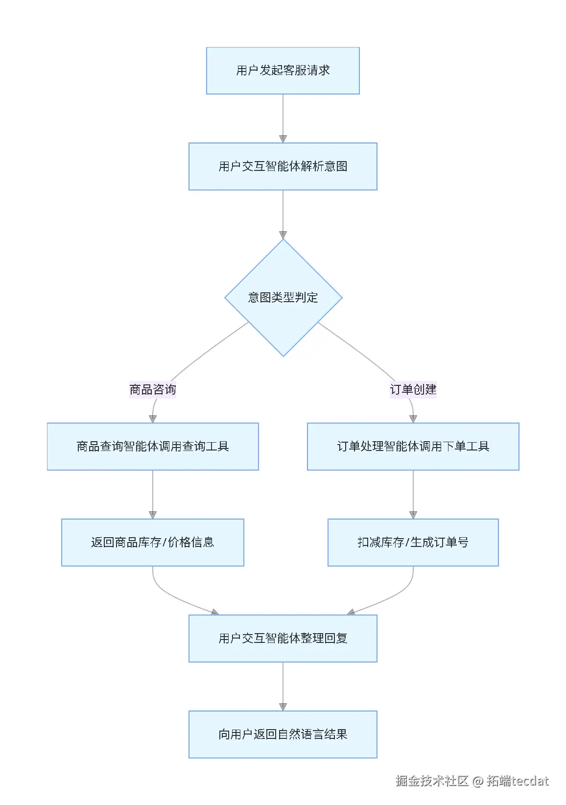 - 用户交互智能体:作为客服系统的“前台”,直接对接用户,核心职责是解析用户意图(咨询/购买/查订单),调用对应智能体的工具,最后整理结果回复用户。