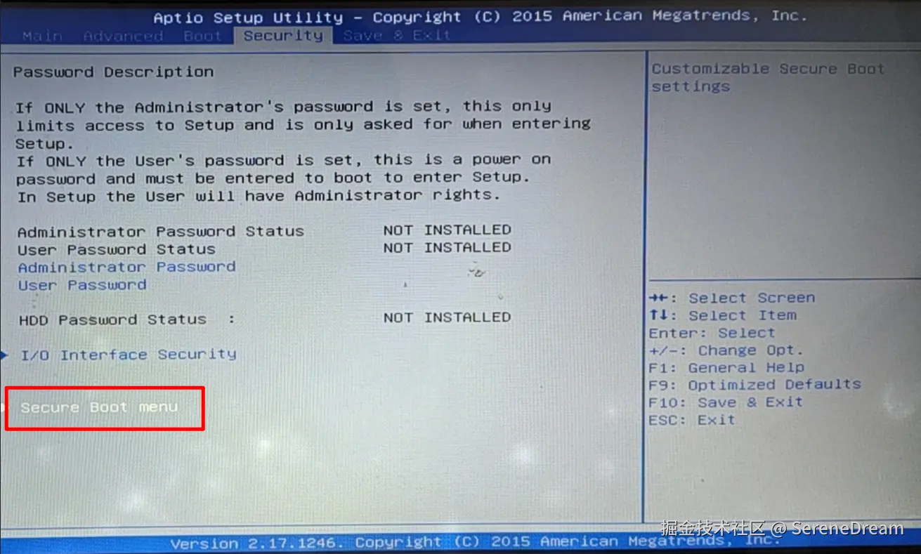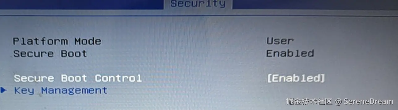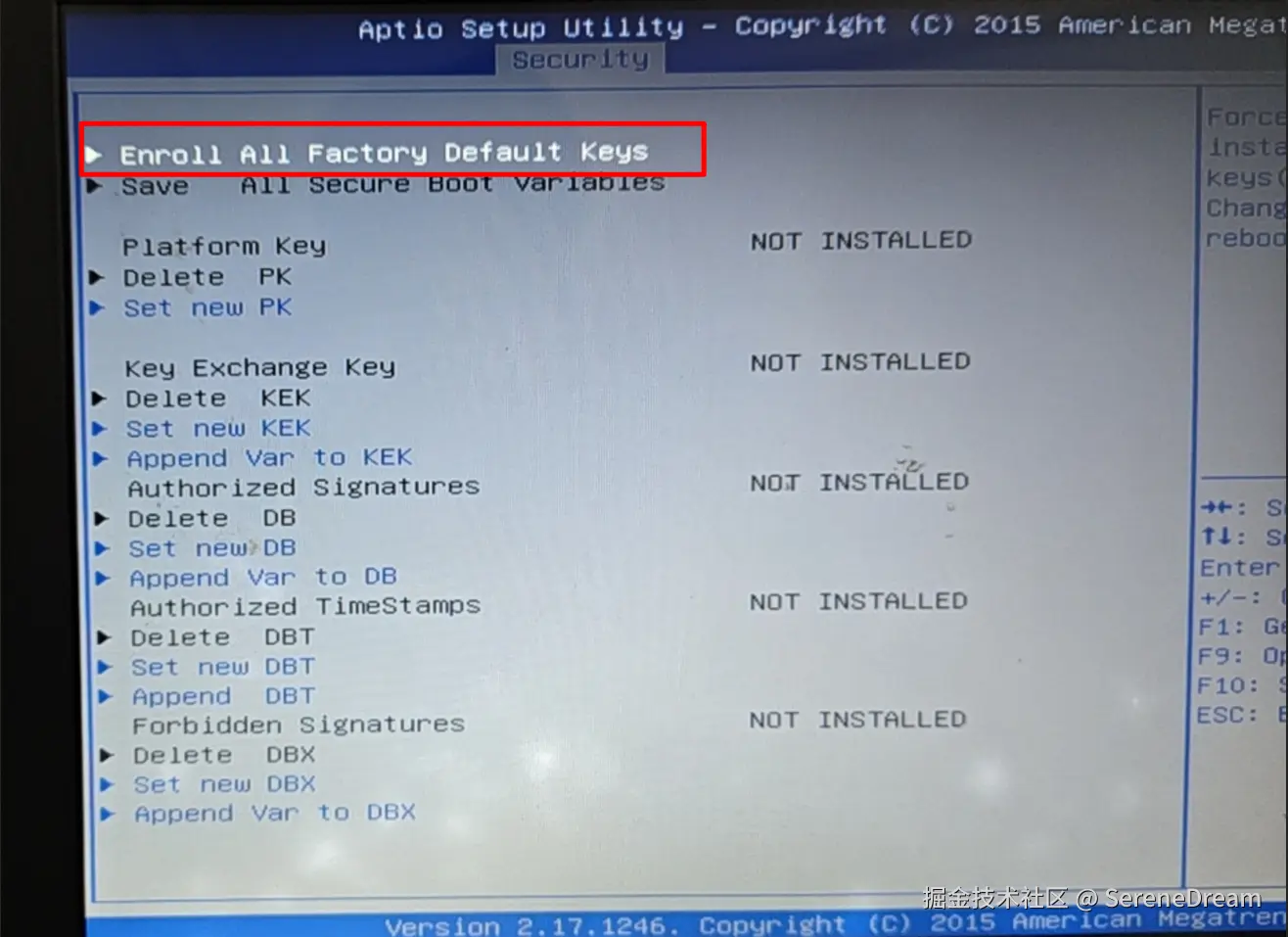但是目前 Platform Mode 为 User ,需要删除平台密钥,使其变为 Setup 才行,点击 Key Management,当光标位于 Enroll All Factory Default Keys 时回车,删除所有的密钥