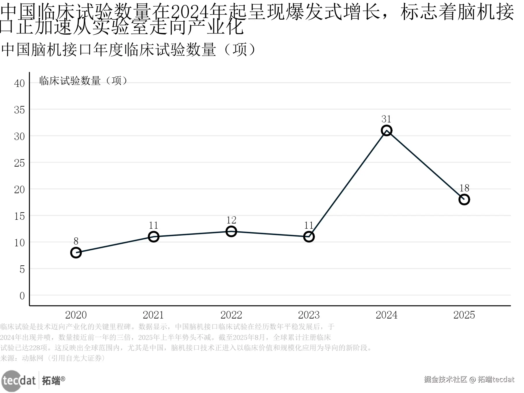 中国脑机接口年度临床试验数量,从2023年的11项增长至2024年的31项,2025年上半年已达18项。