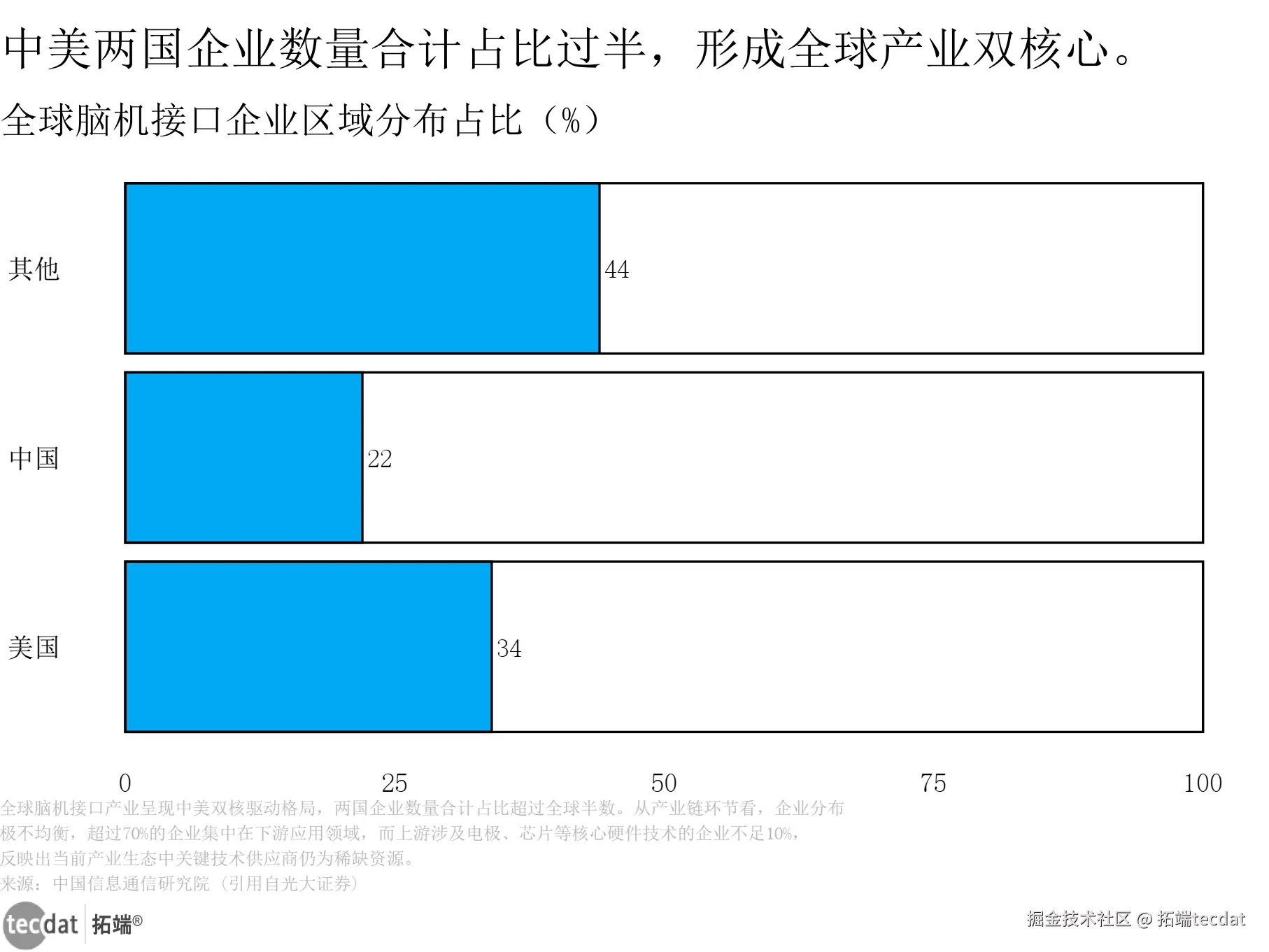 全球脑机接口企业中,美国企业占比34%,中国企业占比22%,两国合计占比过半,形成全球产业的双核心格局。