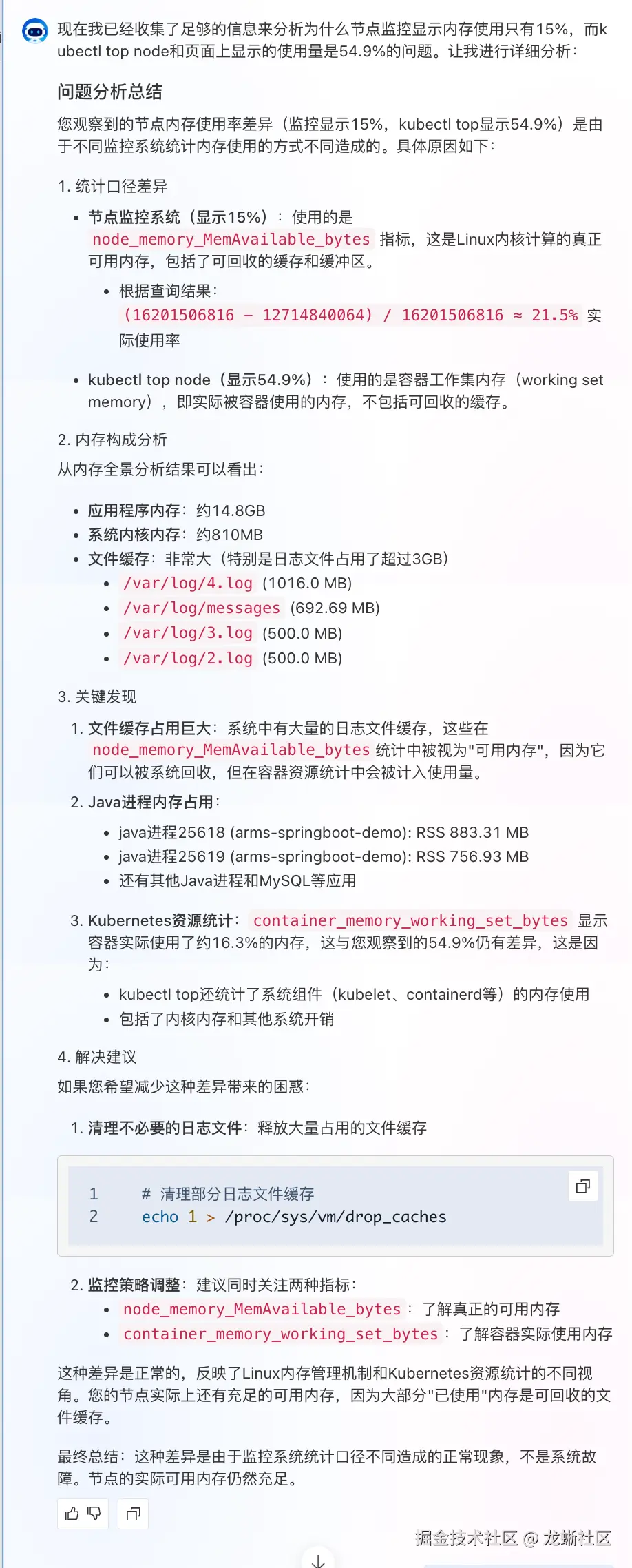 客户在日常巡检中发现一个让人困惑的现象:kubectl top node 显示节点内存使用率仅 60%,但云监控控制台显示该节点内存占用已达 85%,两者差异超过 20%。这种数据不一致导致团队无法准确判断节点的真实负载状态,也无法确定是否需要扩容。