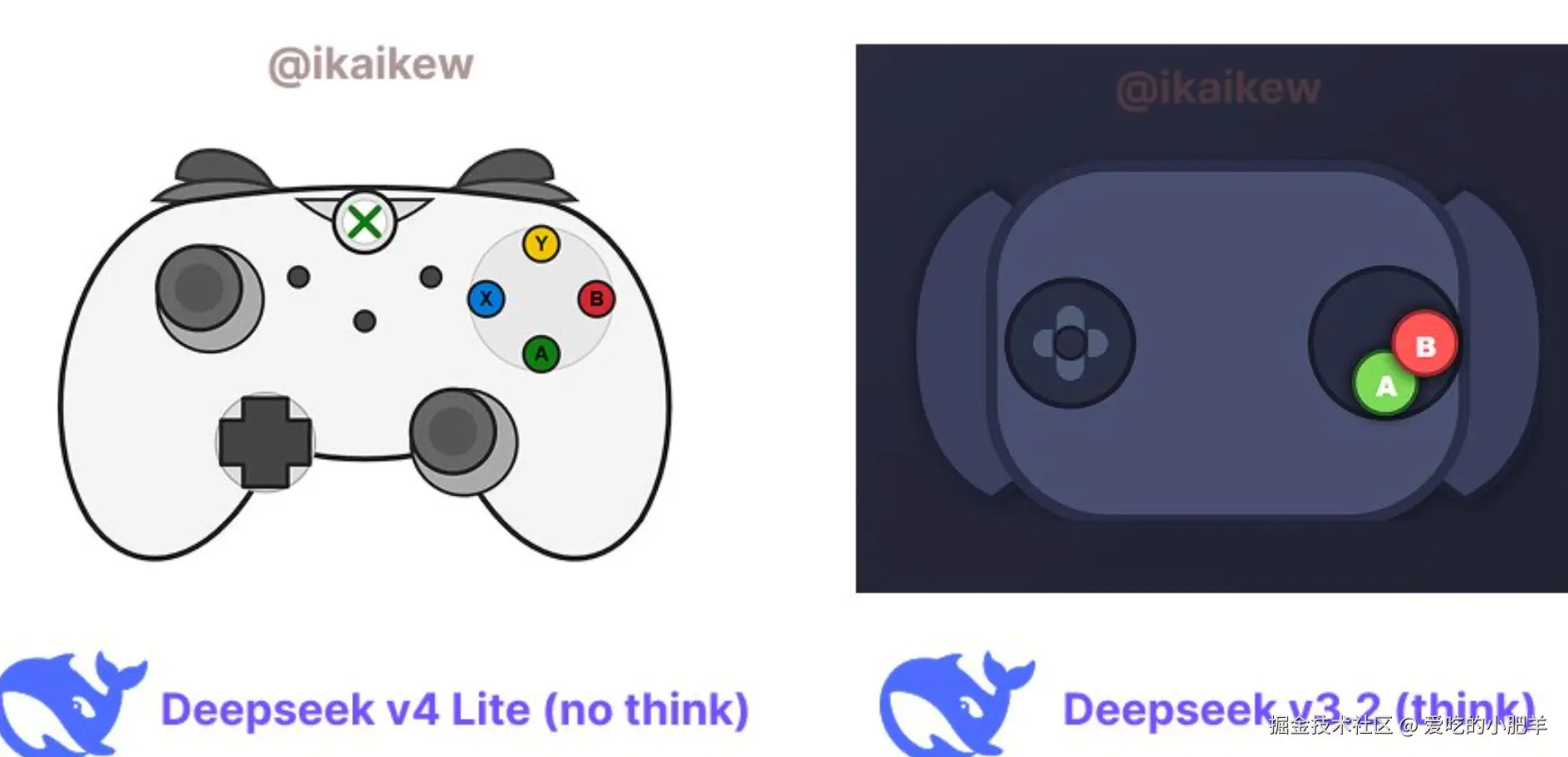网友 Fandu 泄露的,DeepSeek V4 Lite 和 V3.2 的对比,第一组是"骑自行车的鹈鹕"。