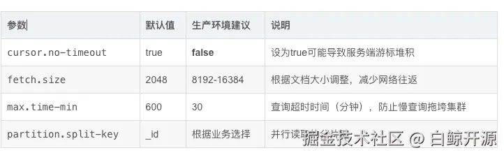 我们踩过的一个大坑:cursor.no-timeout=true配合大数据量查询,MongoDB服务端积累了上百个游标,每个都占用内存,差点把集群搞挂。后来改成: