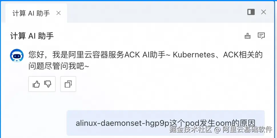 ACK AI 助手是构建在阿里云容器服务 ACK 之上的智能运维助手。