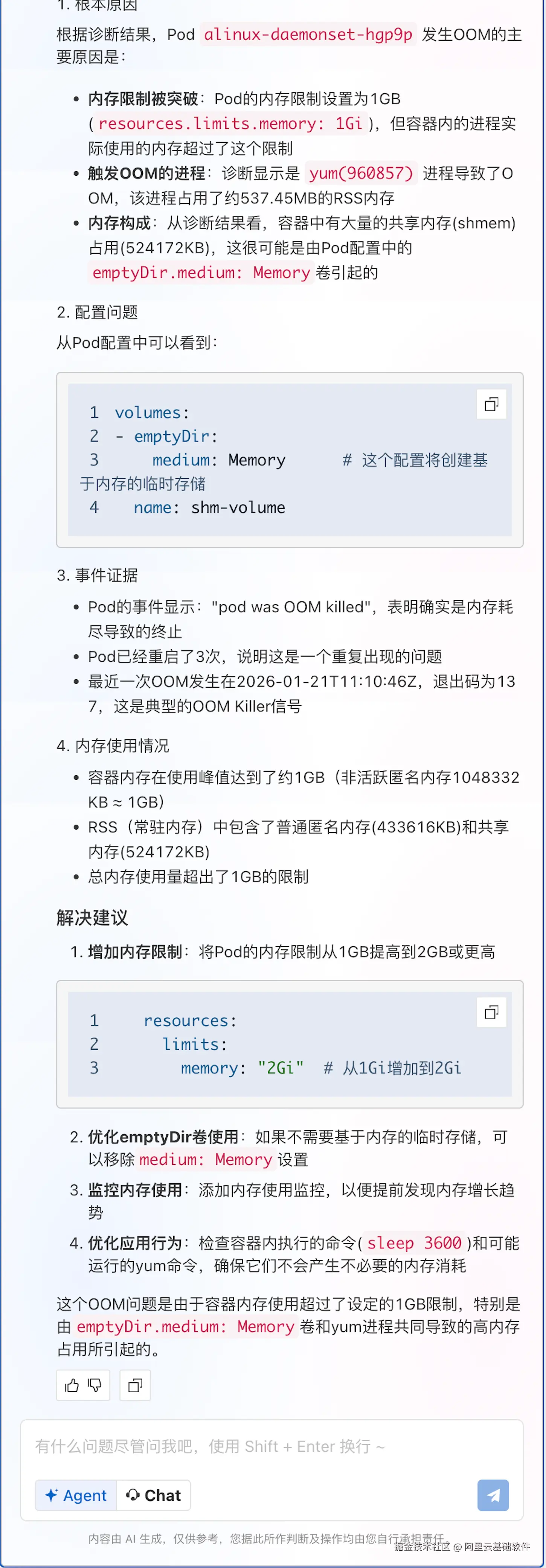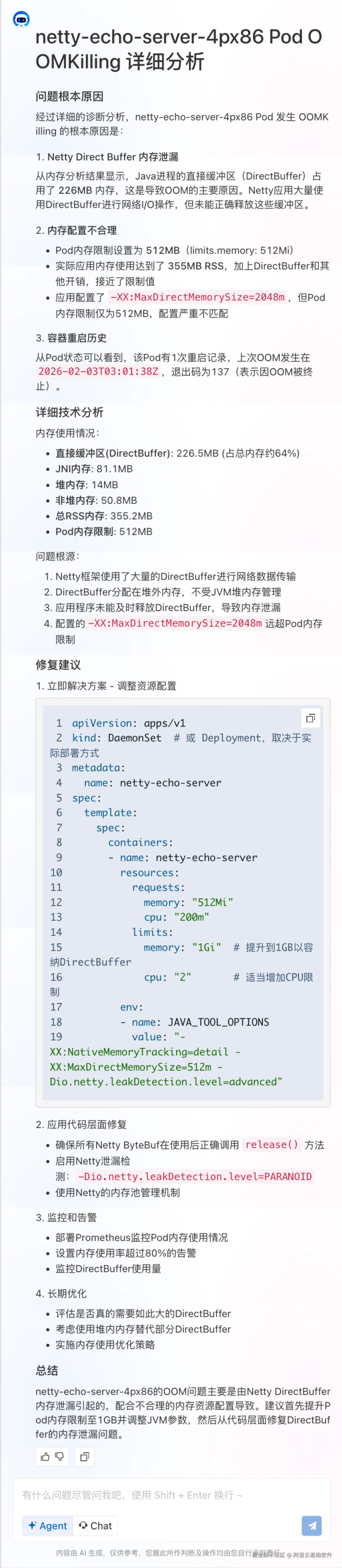 - 元数据自动关联:一次提问,AI 自动关联 Namespace → Deployment/Daemonset → Pod → Node → 实例规格,将 SysOM 的进程数据与 K8s 对象一一对应。SysOM 告诉你“是什么”(内核层面的内存异常根因结论),ACK MCP 告诉你“为什么”(K8s 配置上下文),两者结合才能形成完整的根因定位。