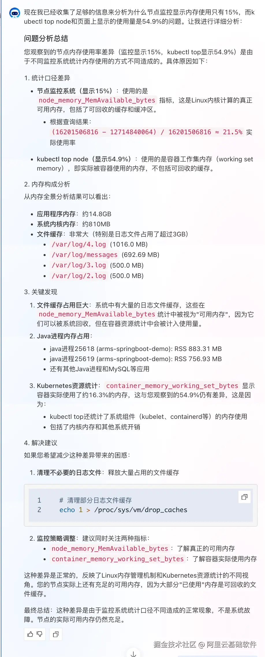 | ACK AI 助手 | 缺乏底层数据 | Prometheus 只展示汇总维度(容器 RSS、节点可用内存),看不到进程级、内核级细节 |