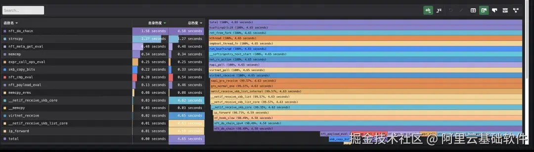 某客户反馈业务网络偶发超时,通过查看进程热点追踪,发现热点在nft_do_chain。下图是热点追踪显示某个时刻网络超时时的函数表和火焰图。