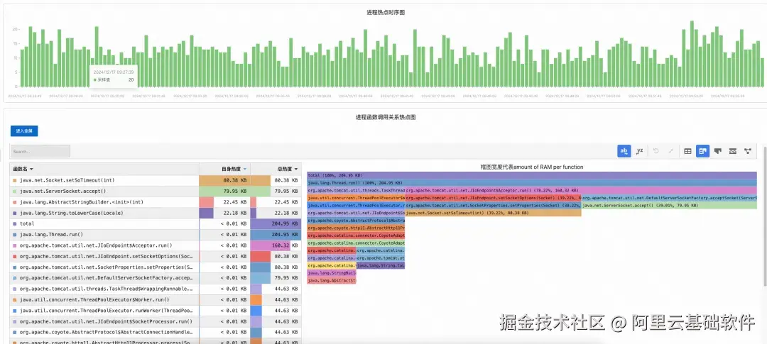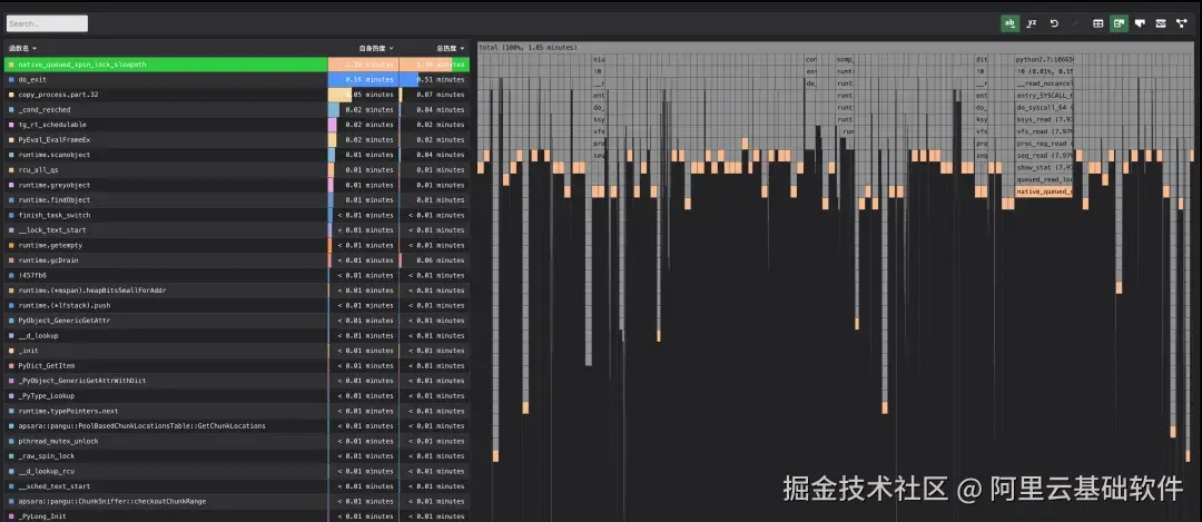 线上问题往往具有偶发性或短暂性,当问题出现时,等到手动执行perf等诊断工具,可能已经错过了最佳诊断时机,无法捕捉到问题发生时的第一现场。因此,我们通过一系列先进的技术手段,实现了进程热点追踪的常态化采集。这一采集机制对系统资源的消耗极低,几乎不会对正常业务运行产生影响。借助 SysOM 进程热点追踪功能,当业务出现历史抖动或其他异常时,无需人工手动登录机器或实时值守,即可随时查看过往时间段内进程的运行状态,快速定位问题根源,提升运维效率。
