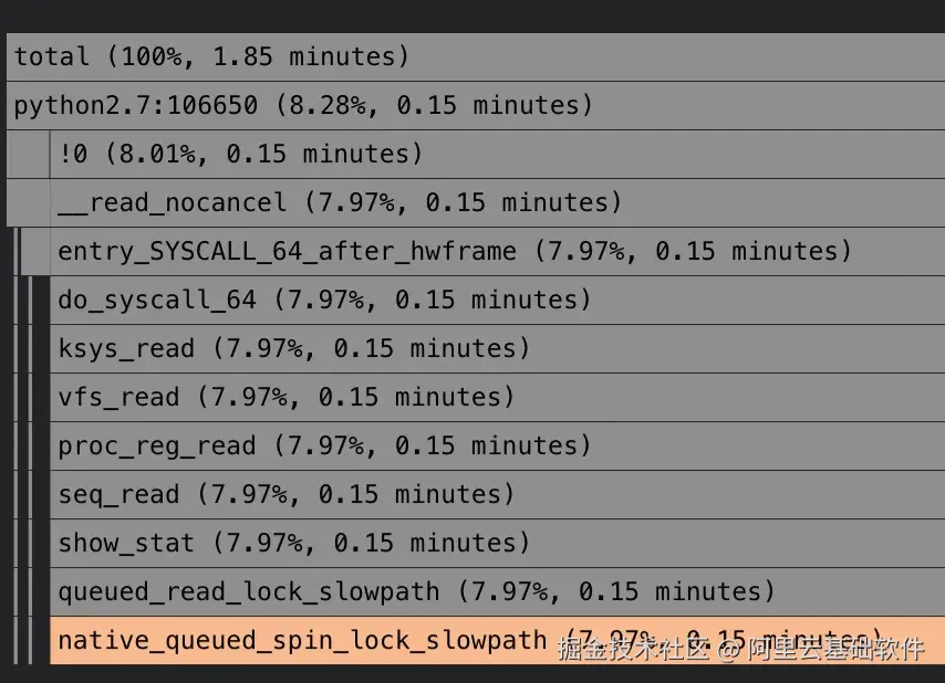 从热点火焰图上我们看到热点最高的是native_queued_spin_lock_slowpath 函数,初步判断这是等锁,是受害者第一现场,点击热点函数,火焰图中可以高亮显示。