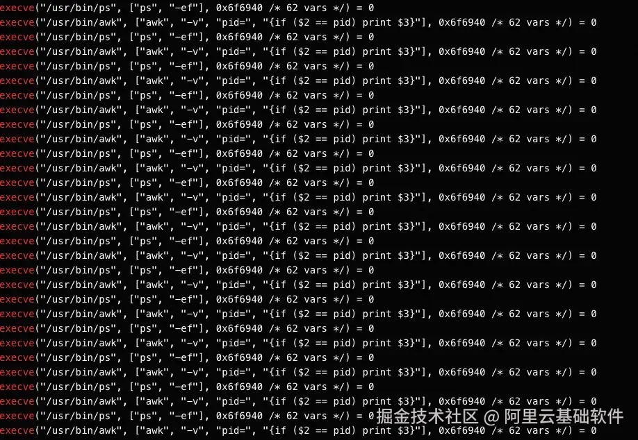 我们了解到,Shell 脚本是通过 execve 系统调用来执行 Shell 命令的,因此我们使用 strace 来跟踪 execve 的调用。从下面的结果图中可以看出,该脚本正在不断重复执行 ps 和 awk 命令。然后在shell脚本源码内搜索ps和awk,很轻松定位到问题源码。