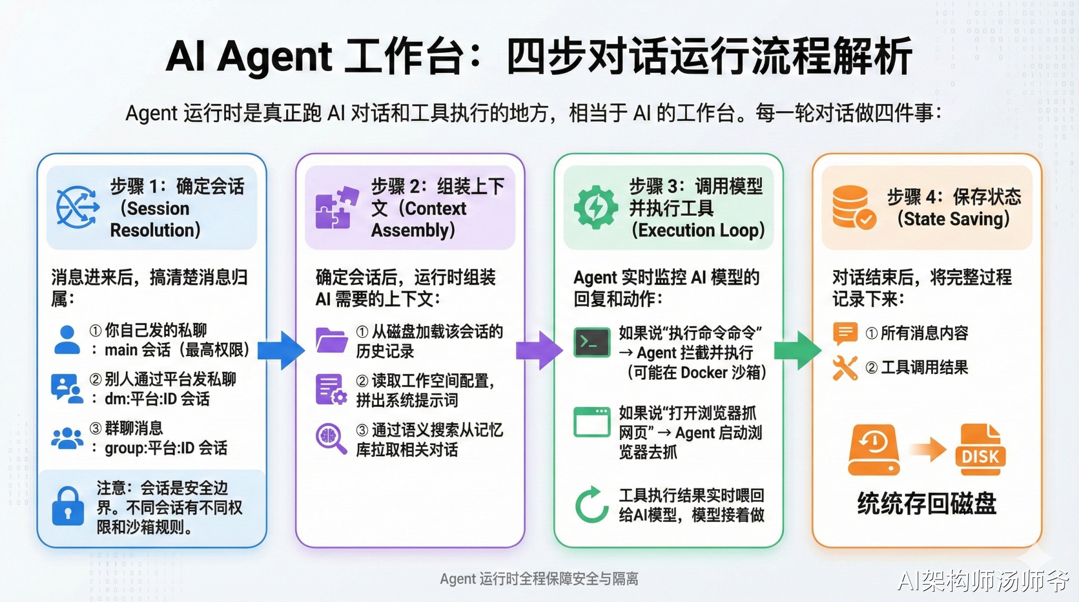 - 智能体(Agent) :真正干活的核心引擎,组装上下文、调用 AI 模型、执行工具操作(比如浏览网页、操作文件、定时任务等)、保存状态。