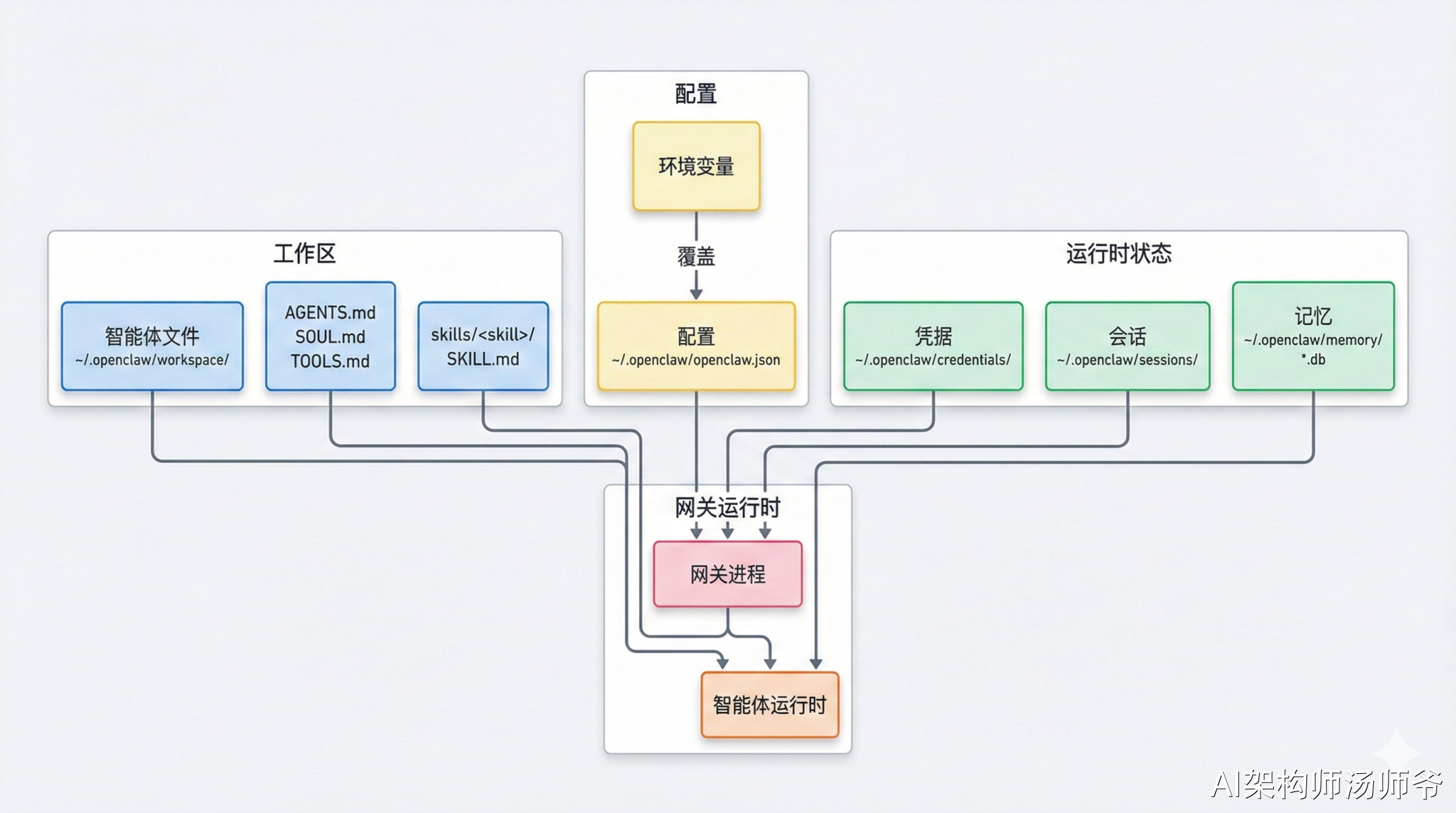 - 网关(Gateway):一个 WebSocket 服务器,连接各种聊天平台和控制界面,把收到的消息派发给 Agent 运行时处理。
