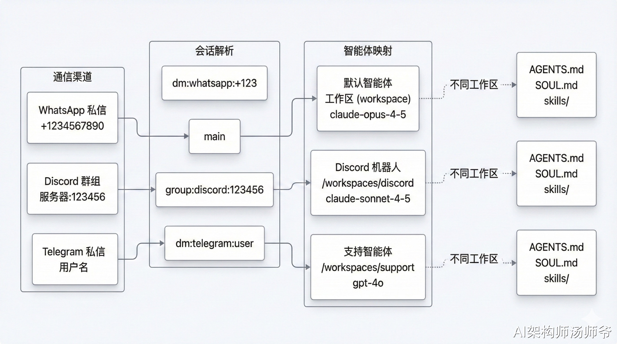 不管你从 WhatsApp、Discord 还是 飞书、钉钉 发消息,体验是一致的。