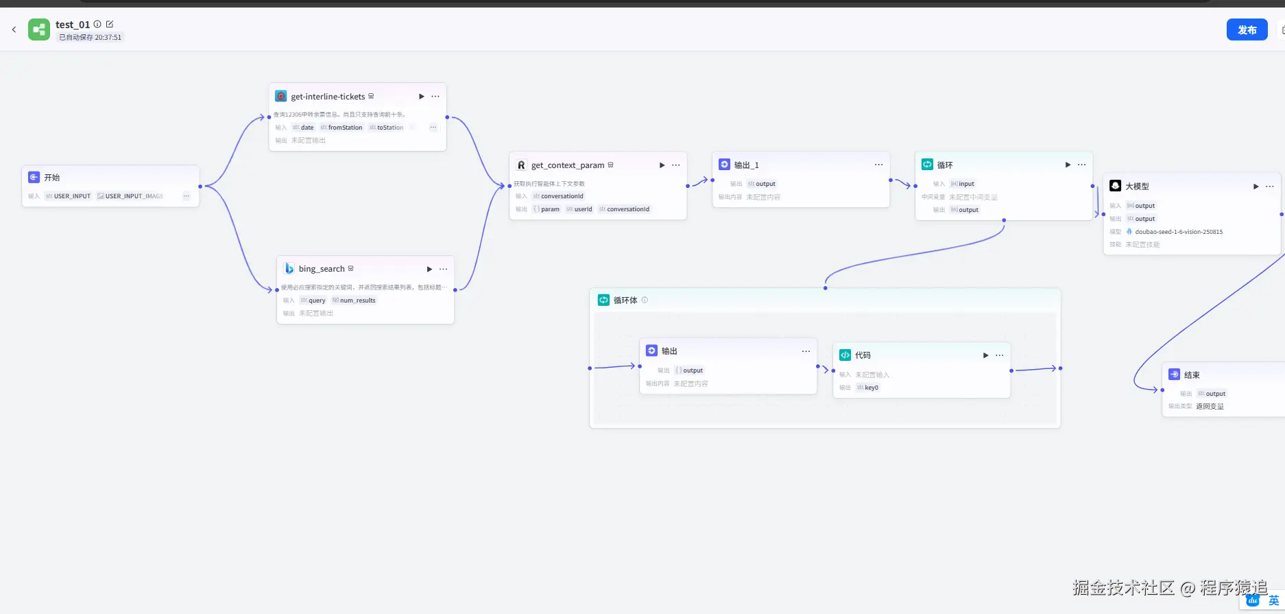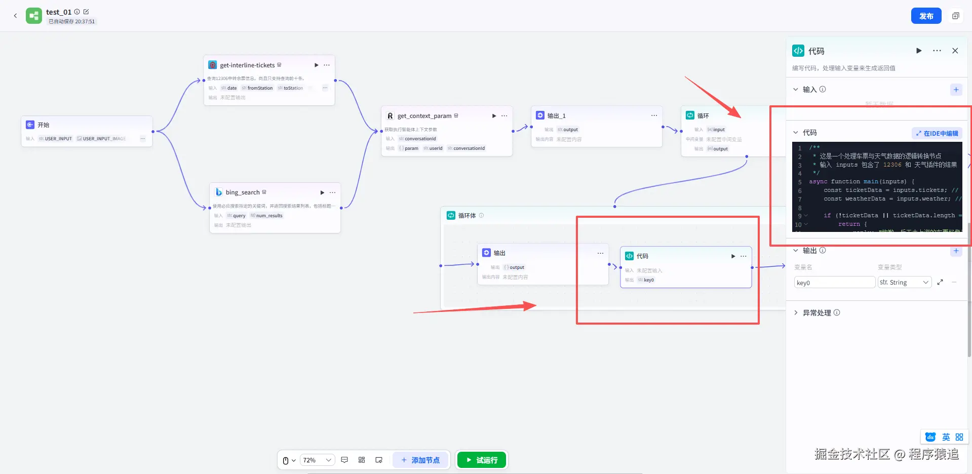 在灵珠平台中,MCP 插件的调用是自动化的,但数据的前后置处理需要开发者介入。同样的操作,在我们循环体里面添加下面的代码,添加查询金价、谣言鉴别的插件工作流节点。