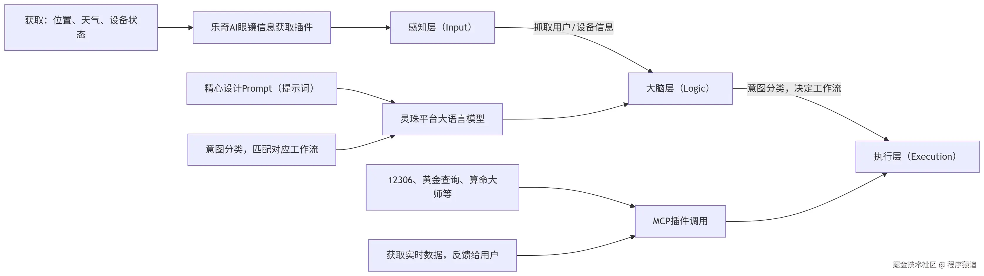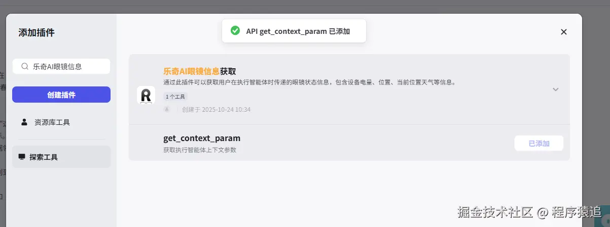 - 感知层(Input) :通过“乐奇AI眼镜信息获取”插件,抓取用户当前的位置、天气、设备状态。