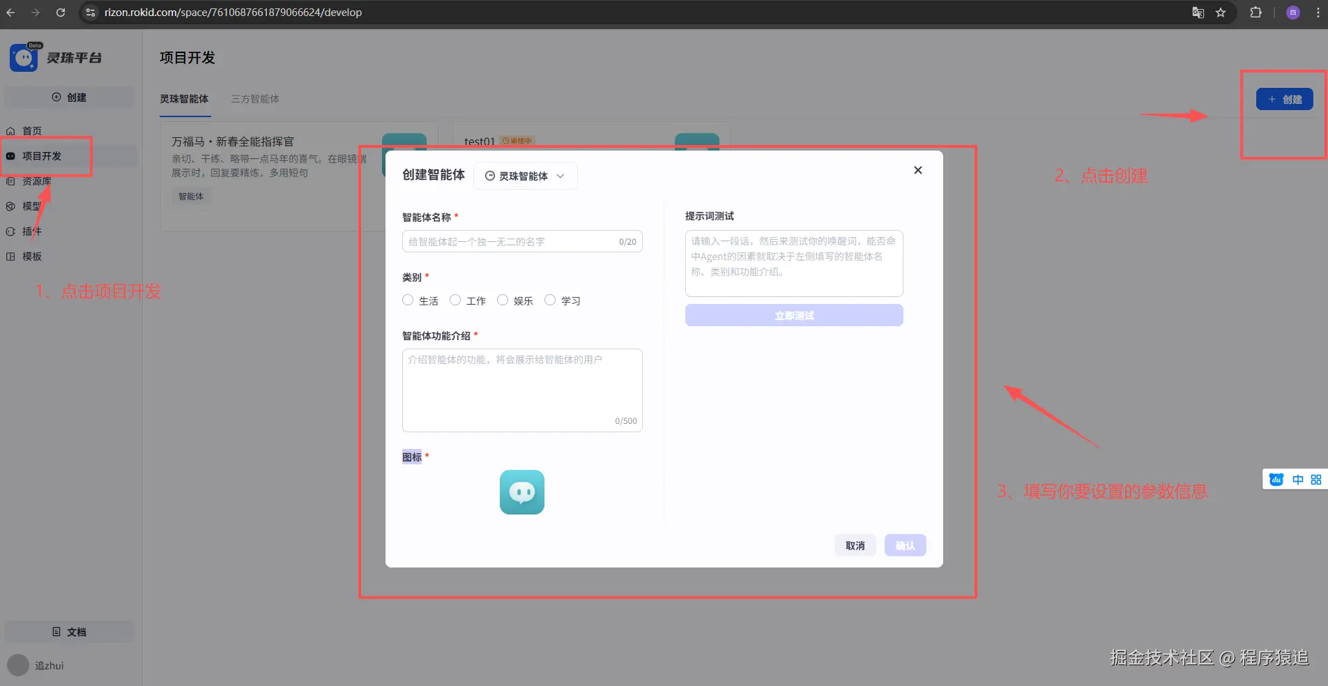 在**灵珠平台**里面点击项目开发,然后点击创建,在弹出的对话框里面填写智能体名称、类别、智能体功能介绍、图标等信息。