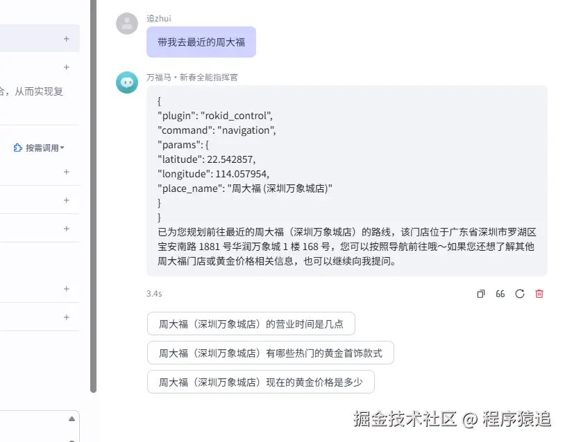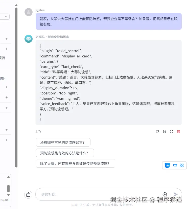 在灵珠的“预览”窗口,我们可以模拟眼镜端的输出。当智能体调用 乐奇AI眼镜控制插件 时,虽然我们手里没有眼镜,但可以在后台看到下发的 JSON 指令。
