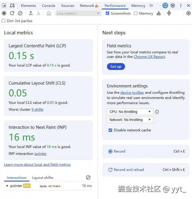 - INP(Interaction to Next Paint) 衡量用户与页面交互(如点击按钮、输入文本)后,系统响应并更新屏幕所需的时间。它聚焦于最差的一次交互延迟,体现页面是否“跟手”。