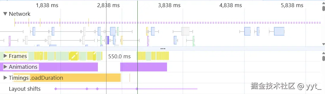 在 Performance 面板中,位于 Network 区域下方的时间线展示了页面运行过程中的关键渲染与交互行为,用于评估视觉流畅性与用户体验稳定性。