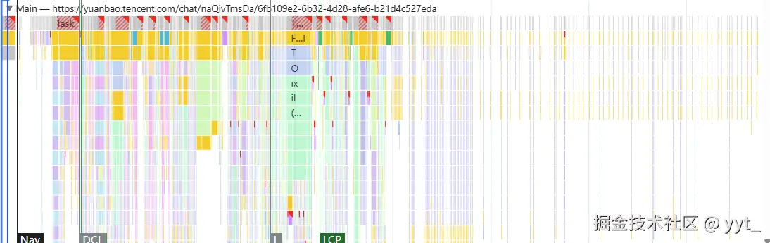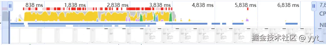 每一横条代表一段 JS 代码正在运行。如果黄色区域持续时间过长(如超过 200ms),说明主线程被阻塞,可能导致页面卡顿、无法及时响应用户操作。 - 🔴 红色竖条:表示 长任务(Long Tasks)