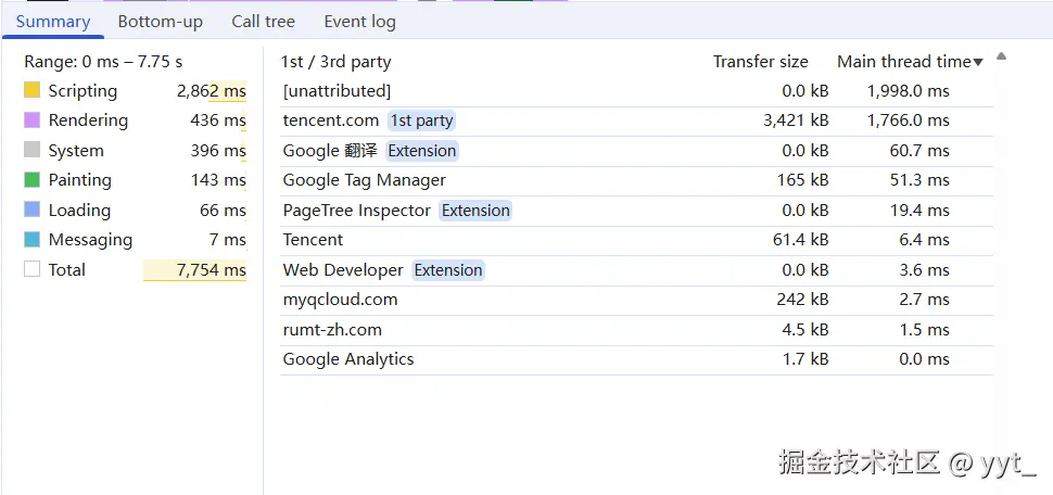 “Summary”(摘要)视图是对整个页面加载过程中主线程活动的统计汇总。它将所有操作按照类型分组,展示了每类任务所消耗的时间,帮助我们快速识别性能瓶颈所在。以下是对图中各项内容的依次说明:
