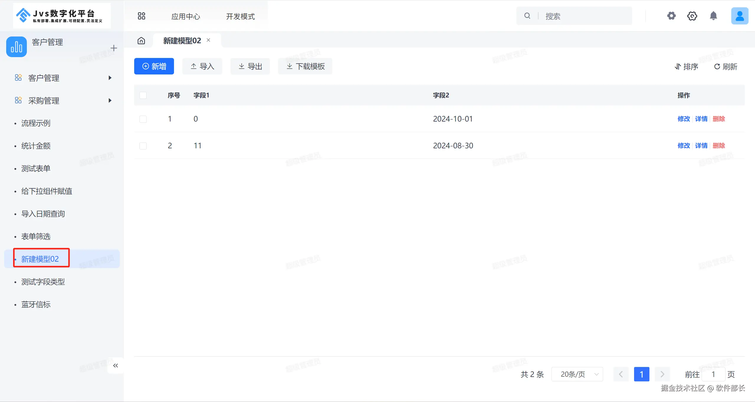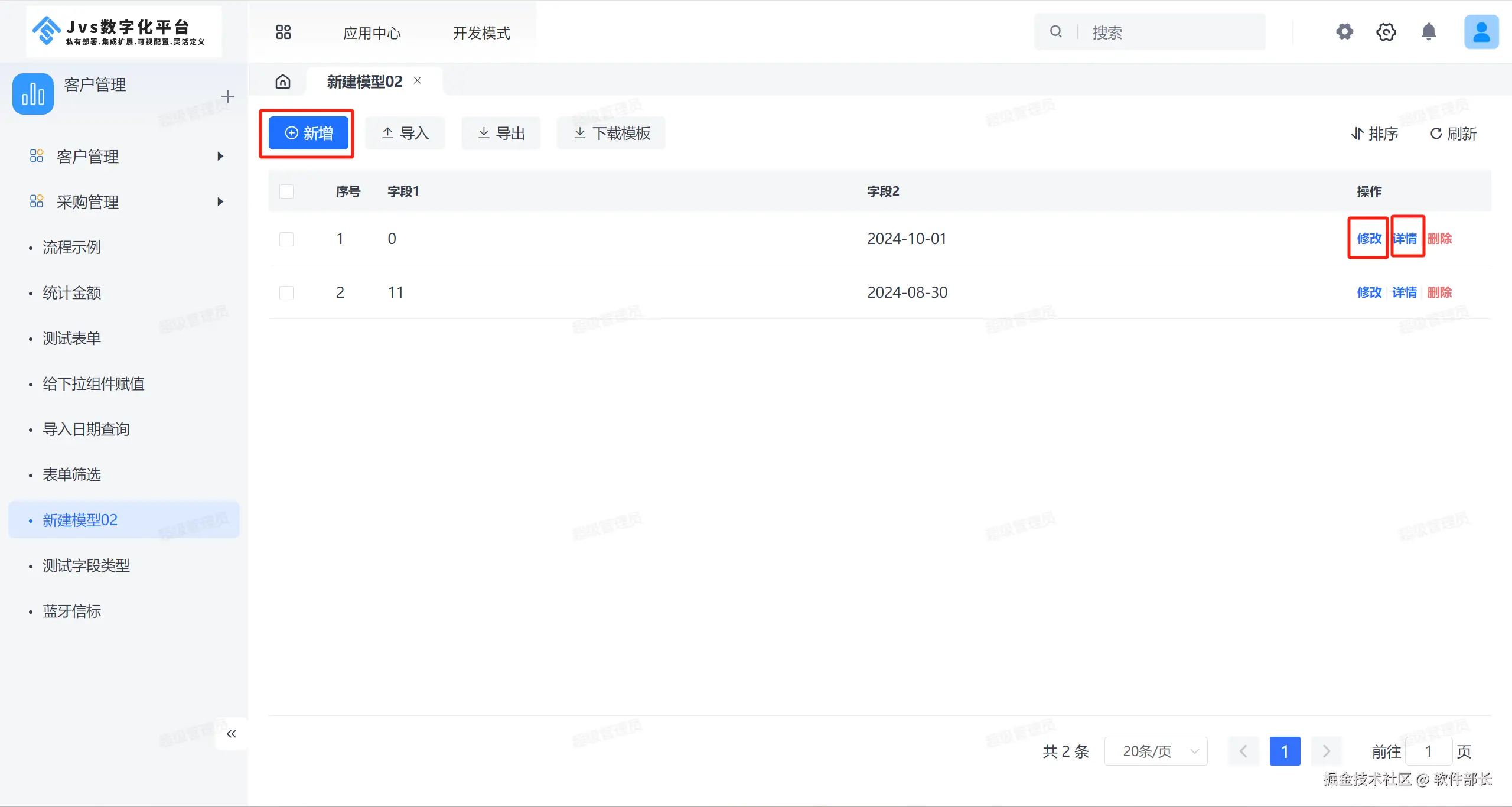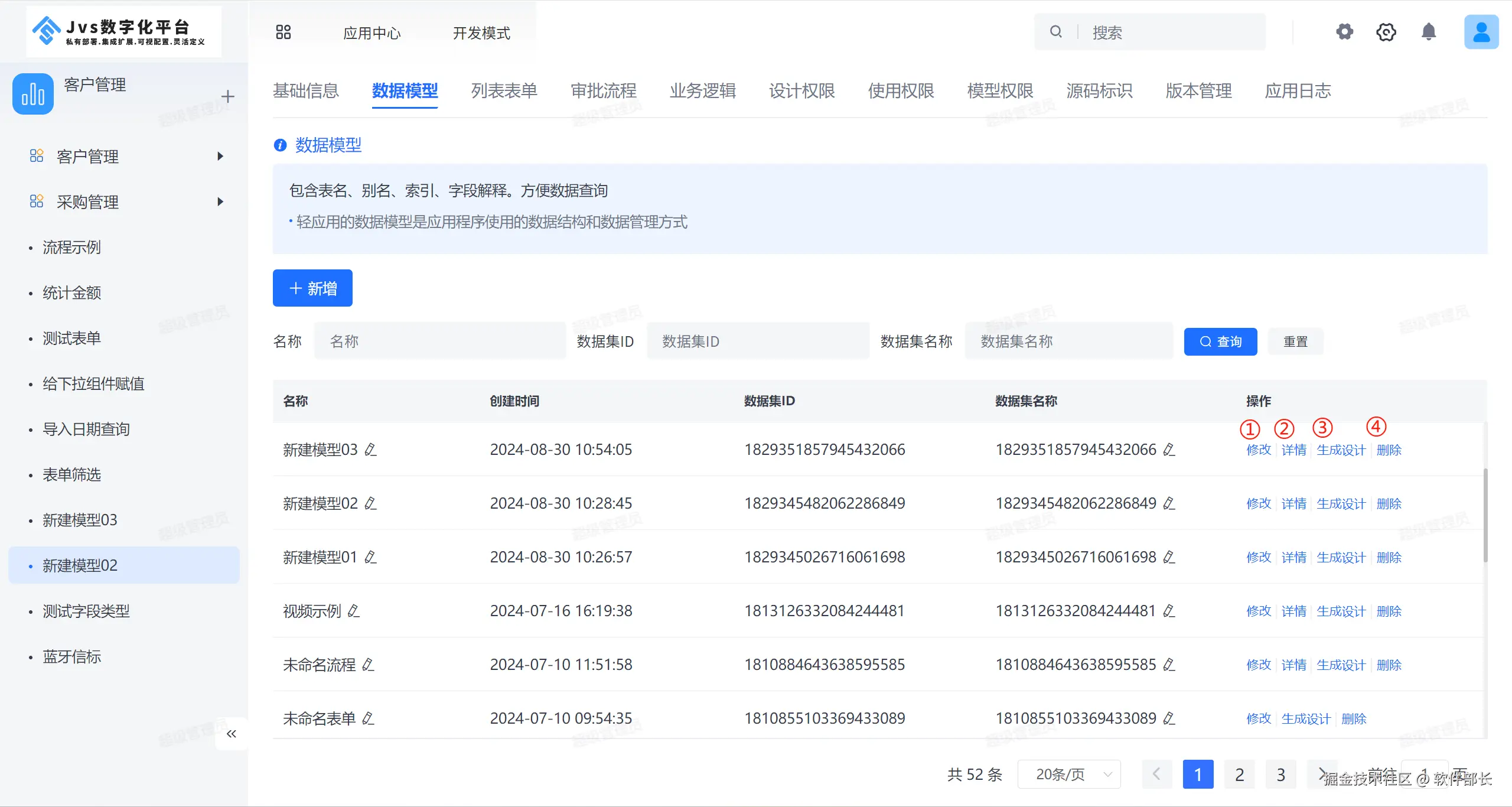 最后点击【提交】即可增加一个模型数据,在模型列表还可以点击【修改】【详情】【删除】按钮操作对应模型数据