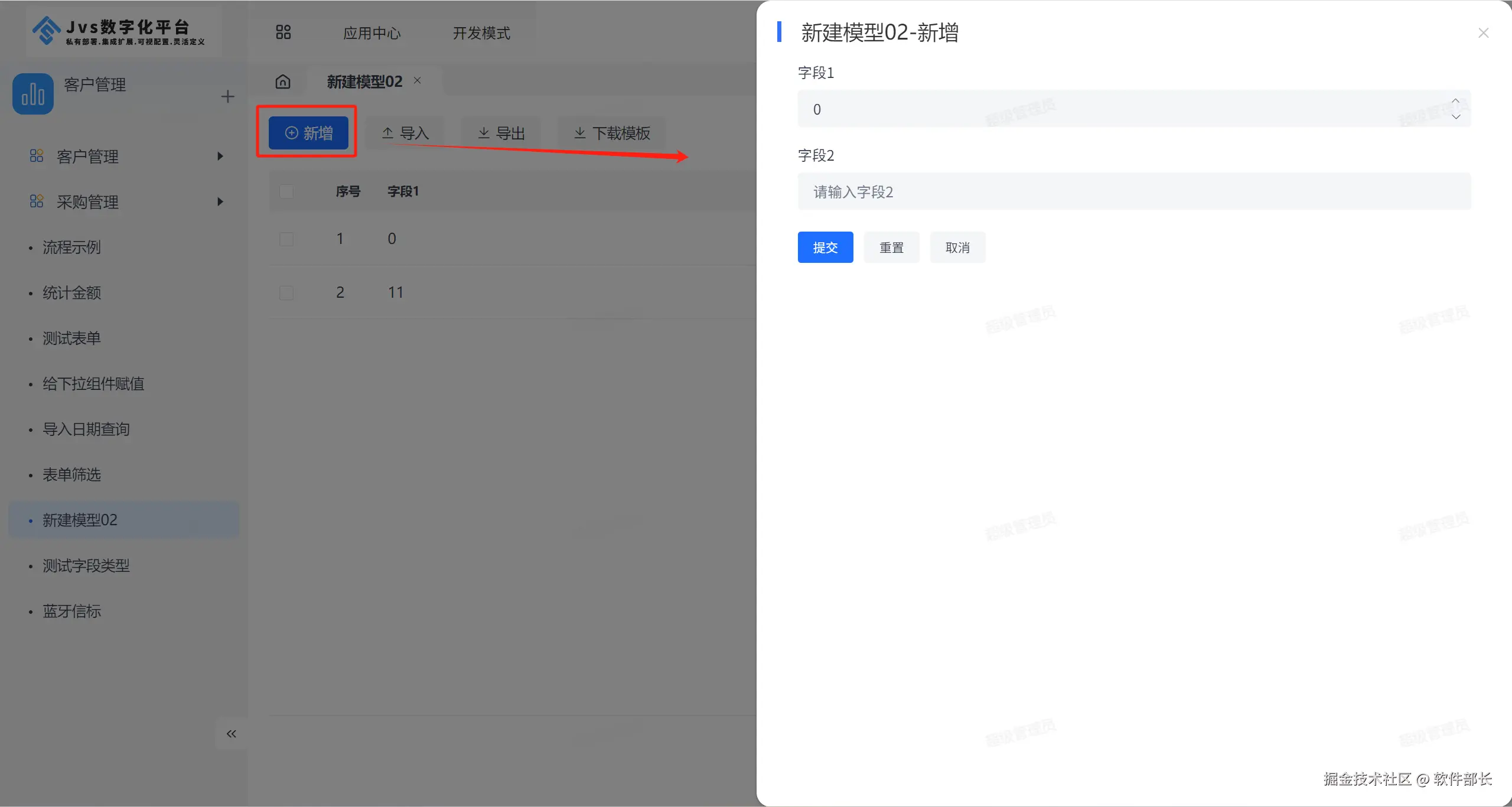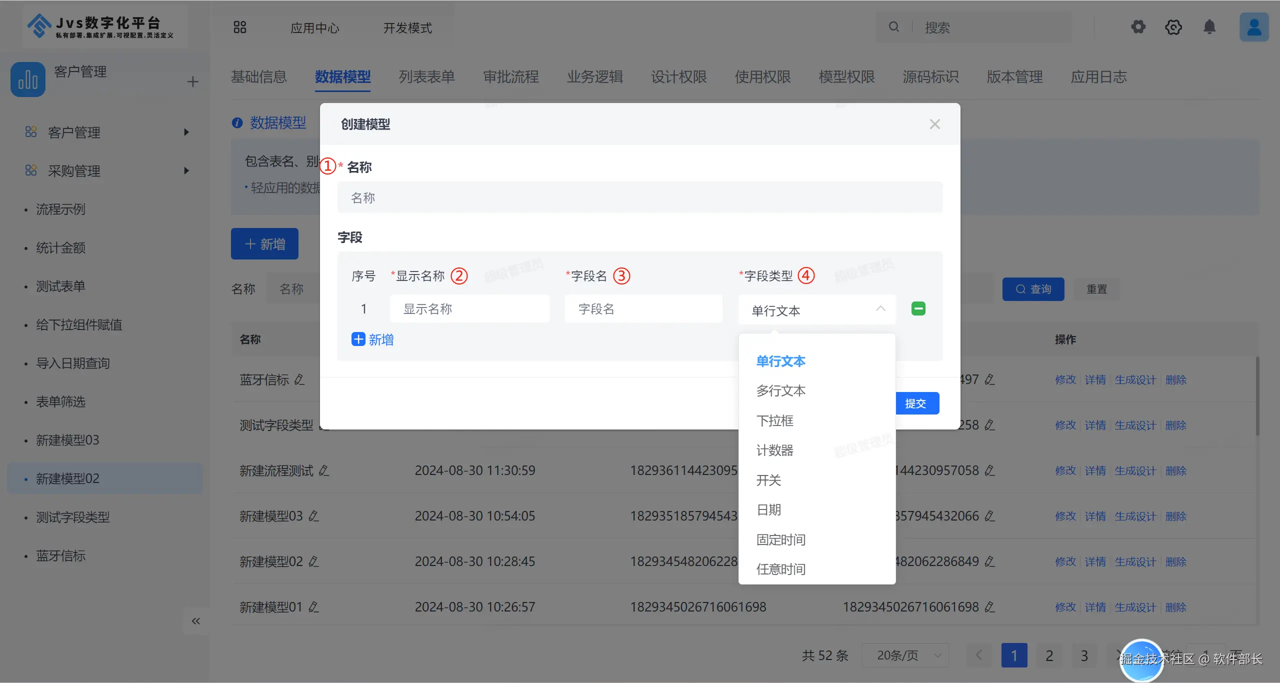 弹框输入模型名称,并点击【新增】字段