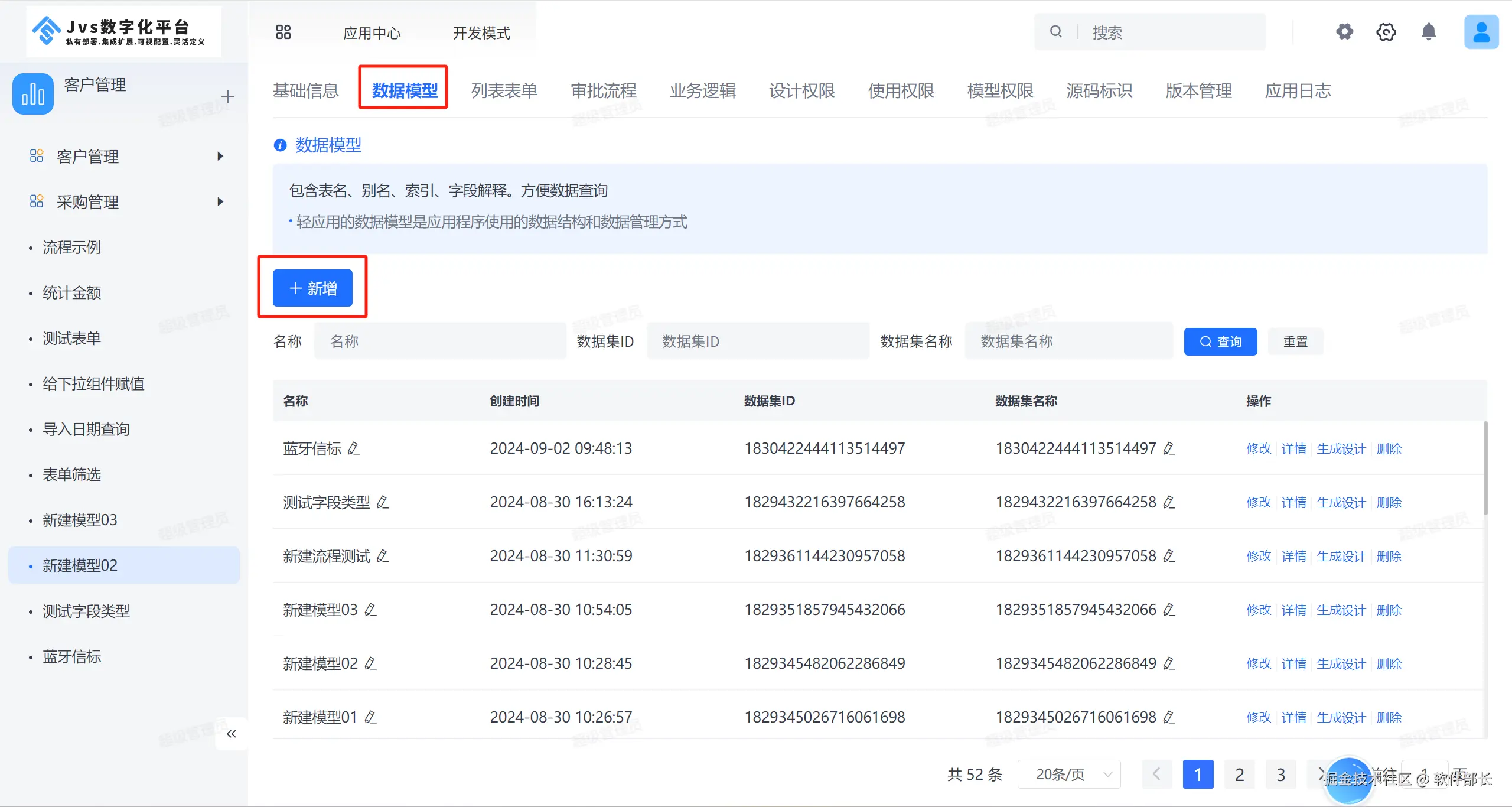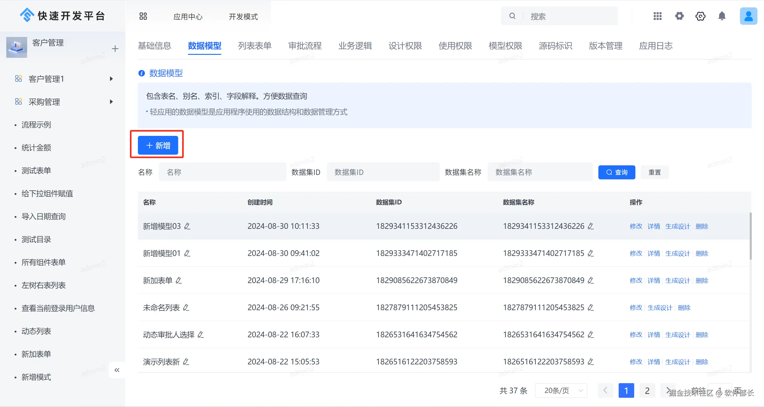 在系统应用后台,点击【数据模型】如下图,点击【新增】按钮