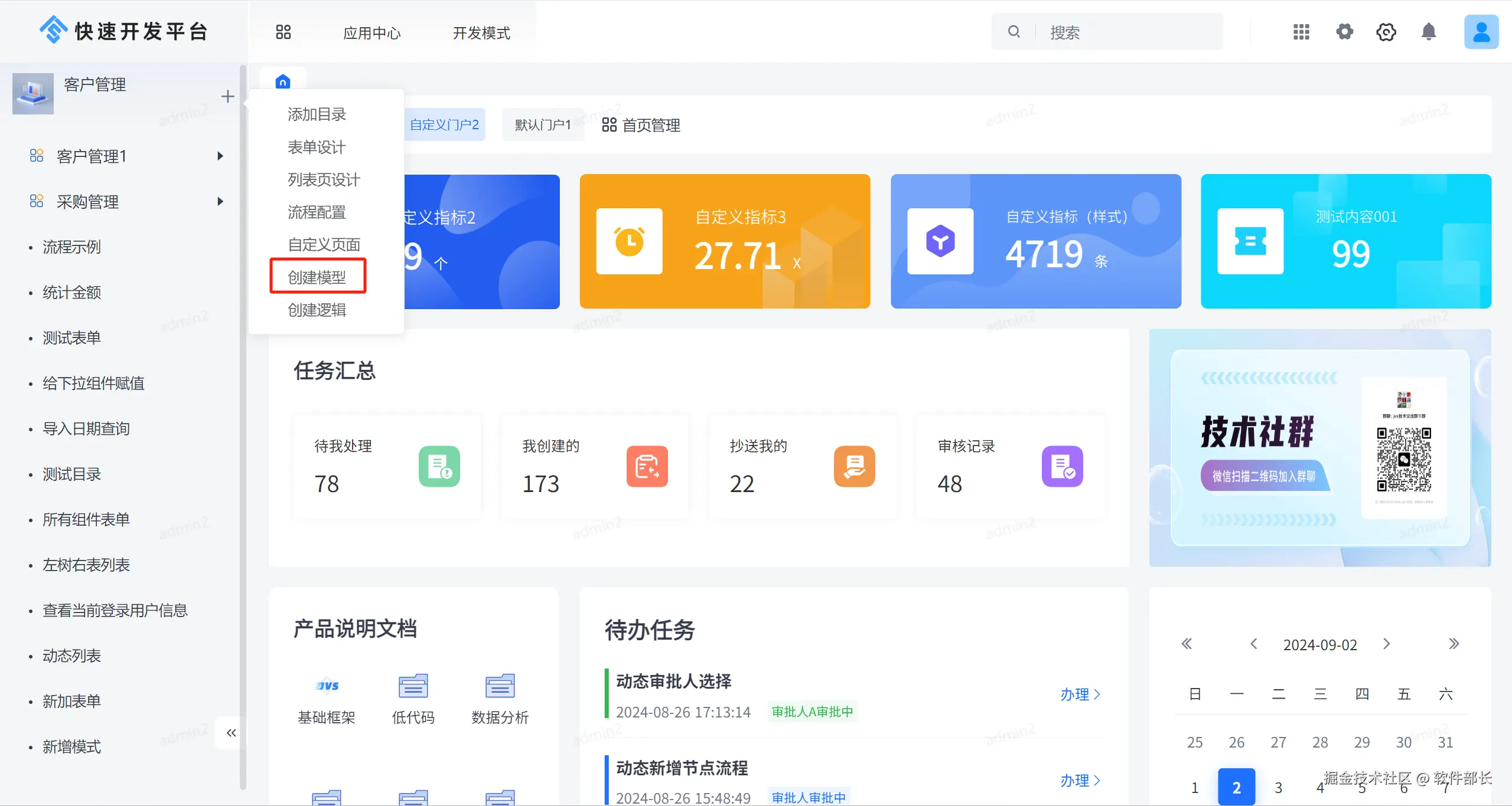 目录上快捷创建模型,若有设计模型字段,会自动创建列表页以及相关的新增、修改、详情表单