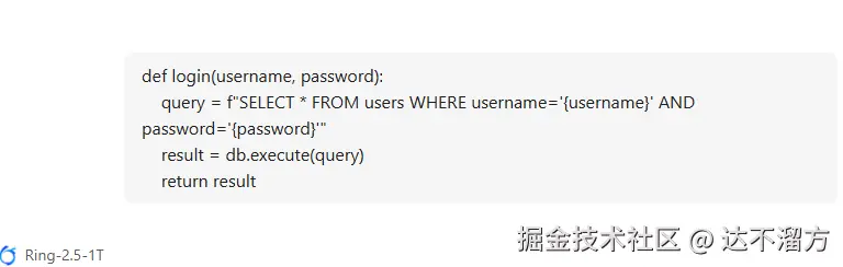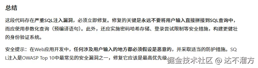 模型立即识别出SQL注入风险,给出了详细的分析和修复方案: