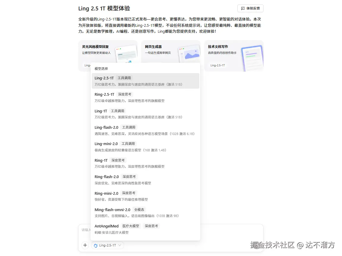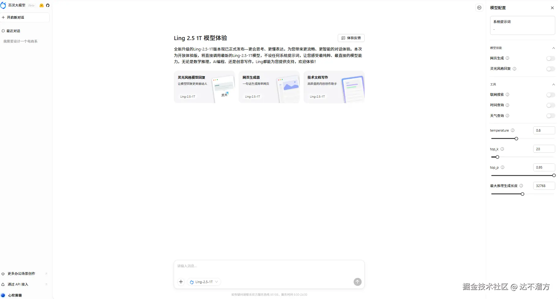 点击下面的模型选择下拉菜单,会看到当前默认使用的是"Ling-2.5-1T"模型。这就是本次体验的主角。