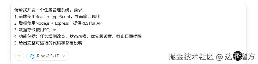 更重要的是,当我询问"如何添加用户认证功能"时,模型能够理解上下文,基于已有代码进行增量开发,而不是重新生成整个项目。这种"长程执行"和"上下文理解"能力,正是Ring-2.5-1T的核心优势。