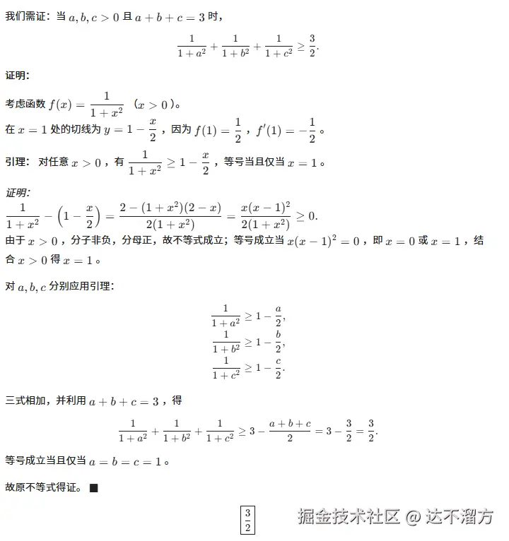 1/(1+a²) + 1/(1+b²) + 1/(1+c²) ≥ 3/2