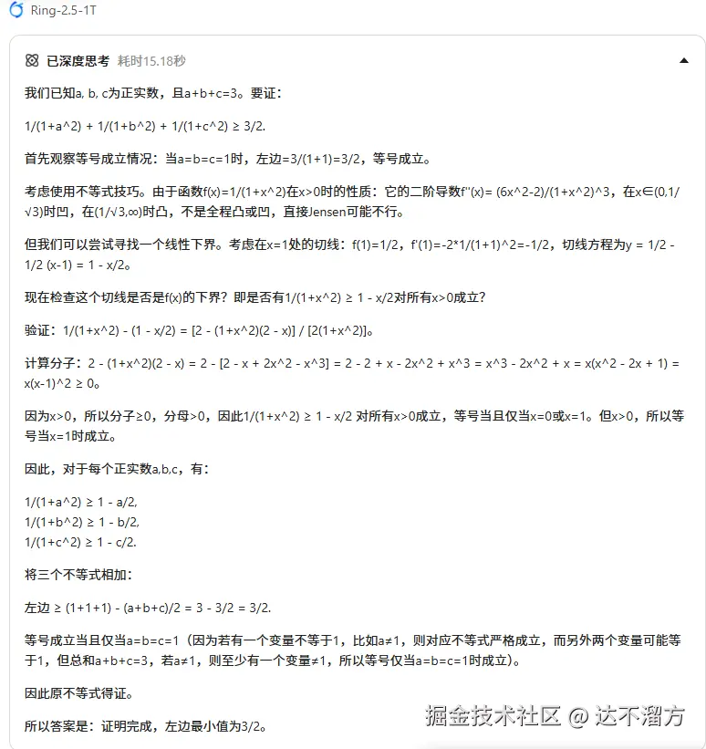 Ring-2.5-1T最大的亮点就是"深度思考"能力。不同于普通模型的快速响应,Ring-2.5-1T会展示完整的思考过程,就像看一位数学家在草稿纸上推演。