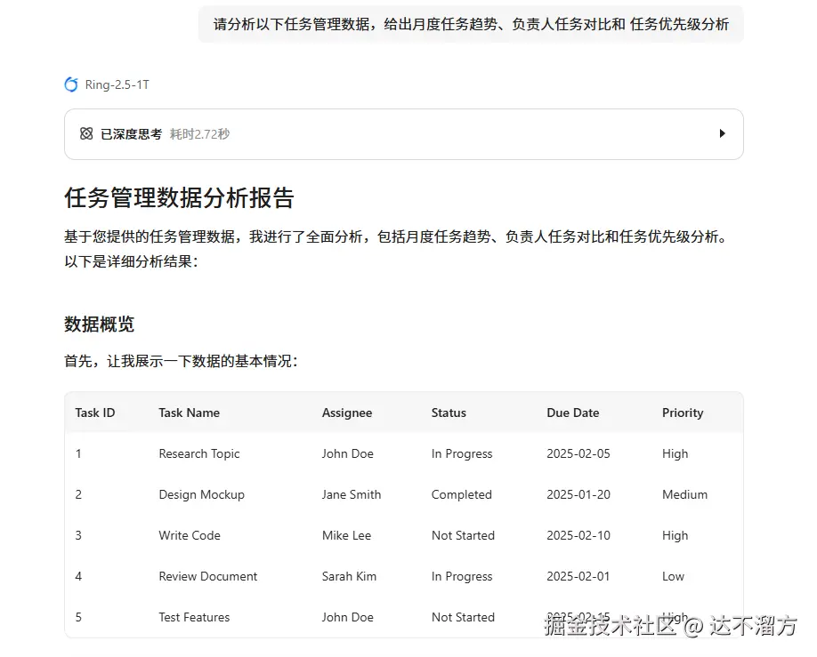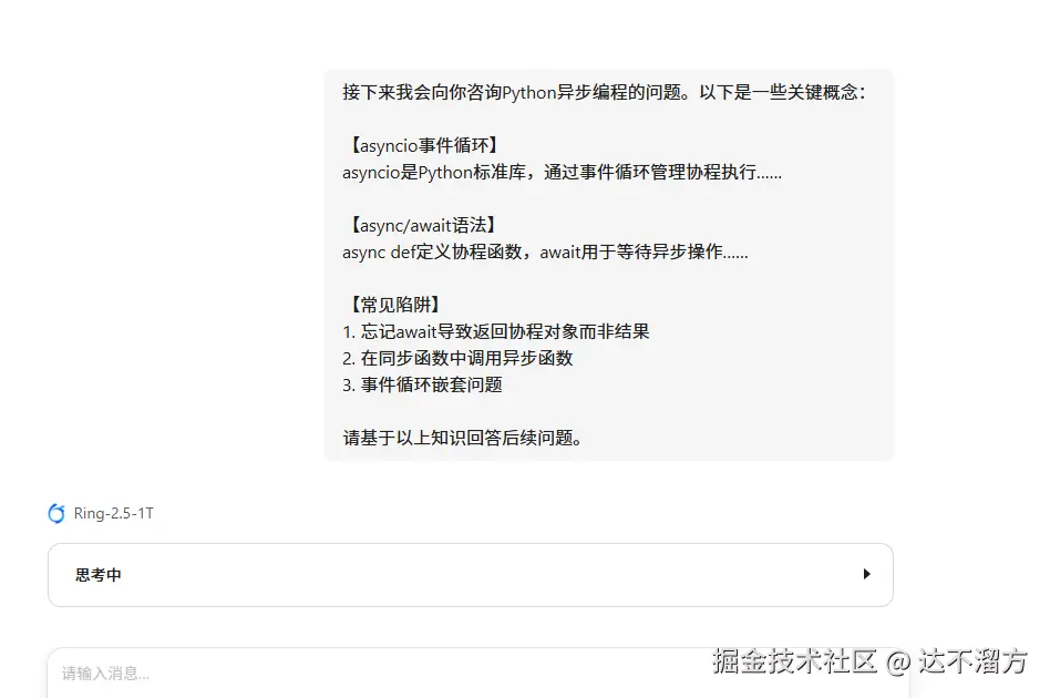 这种"显式思考"的能力,来源于Ring-2.5-1T在强化学习训练中引入的dense reward机制,能够反馈思考过程的严谨性。在实际使用中,这种特性非常适合: